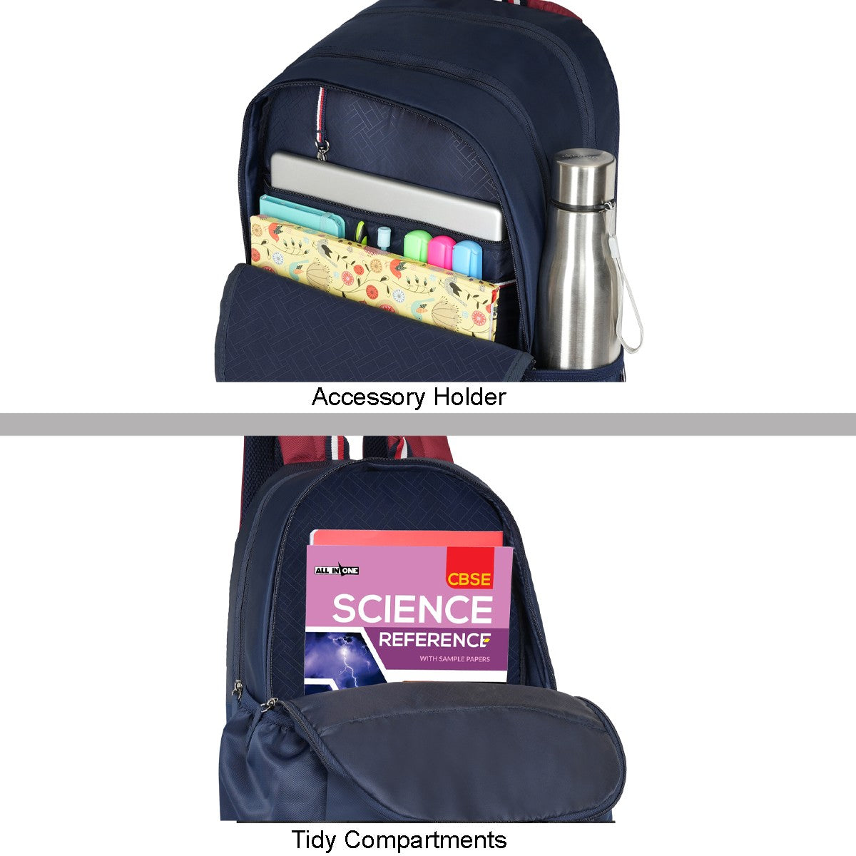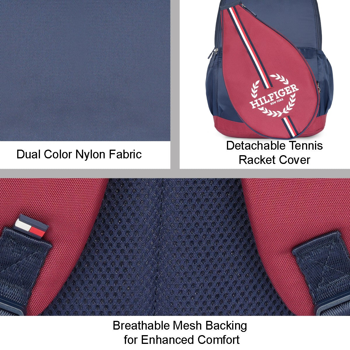 This timeless navy and burgundy backpack is the perfect blend of style and functionality. The water-resistant fabric and breathable mesh back ensure comfort and durability, while the printed branding adds a touch of sophistication. The multiple compartments, including a detachable tennis racket cover, keep you organized.