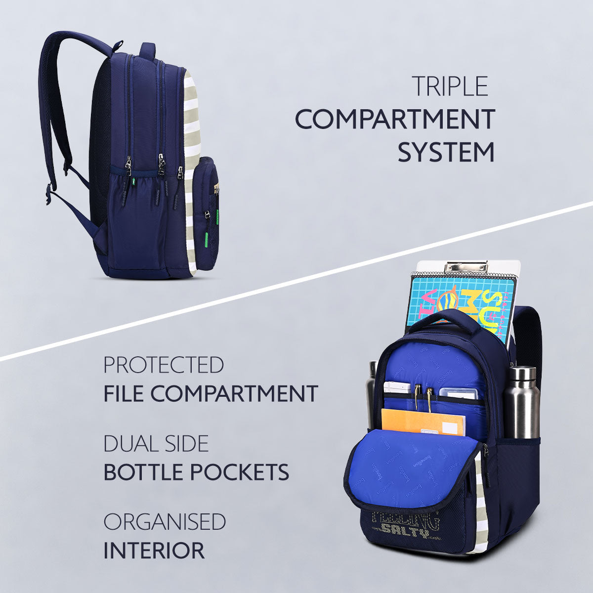 Spacious interior supports heavy books. Organized layout. Maintains balance. Ideal for higher grades. Academic support.