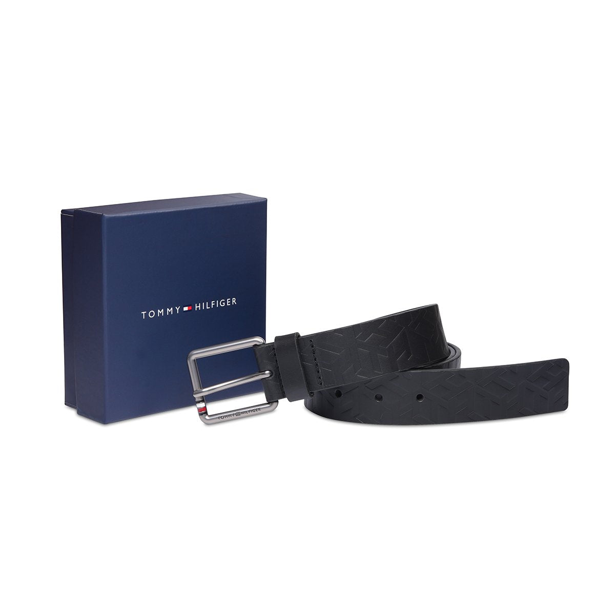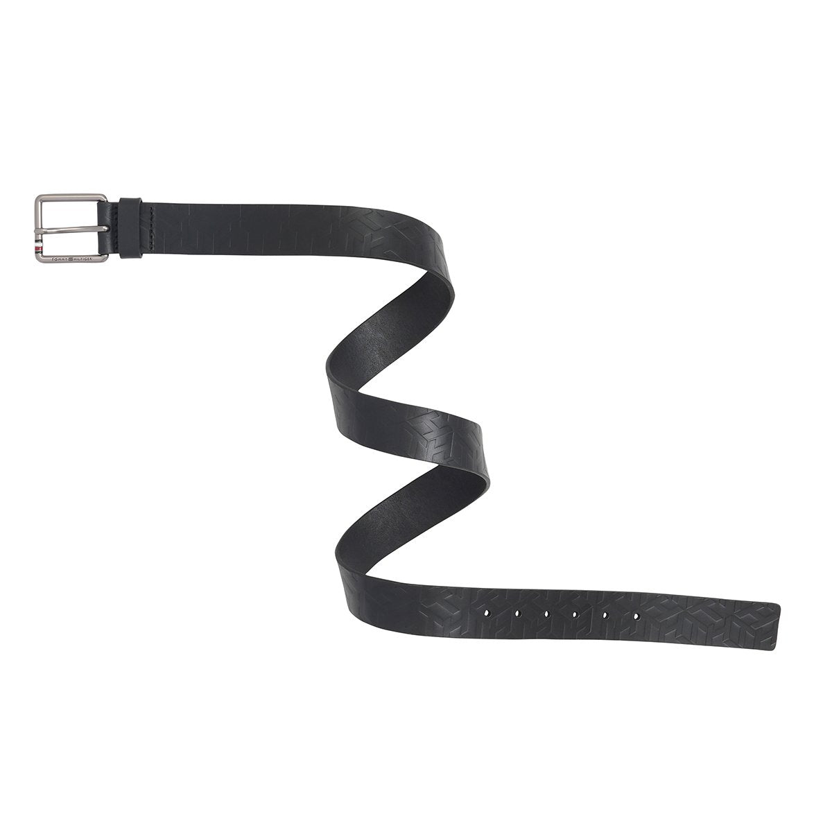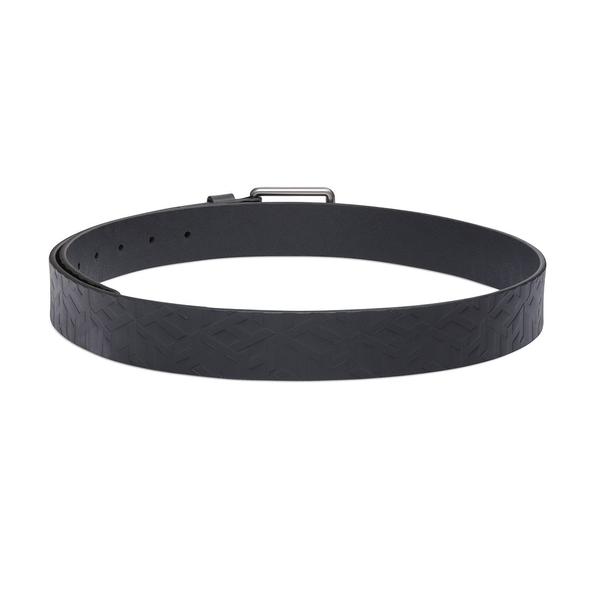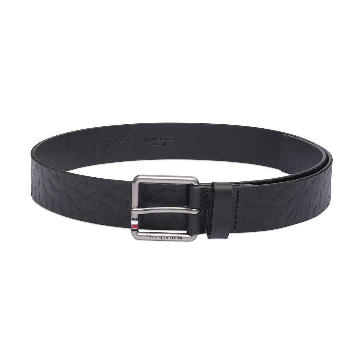 Embossed Sophistication: The Tommy Hilfiger Decorah Men's Non Reversible Belt in black exudes casual elegance. Crafted from genuine leather, its embossed design with a matte gunmetal finish adds a refined touch.