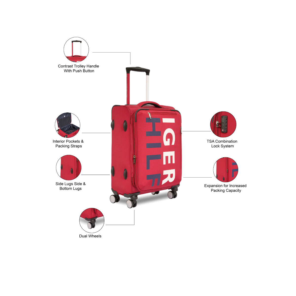 Tommy Hilfiger Miller luggage bag is made with durable fabric with a Hilfiger print on the front. This bag features an easy-to-push aluminum trolley handle and smooth trolley wheels, which makes moving around smooth and comfortable. Additionally, there is ease of organizing with multiple pockets and packaging strap.