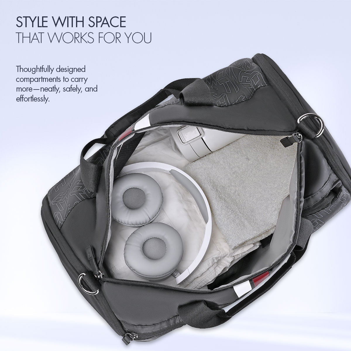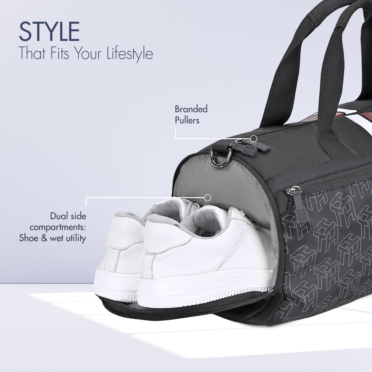 Equipped with dual side compartments, one dedicated for shoes and another for wet utility items, this bag keeps your essentials separated and fresh. A mesh pocket provides quick access to smaller items, while the accessory holder ensures valuables stay secure.