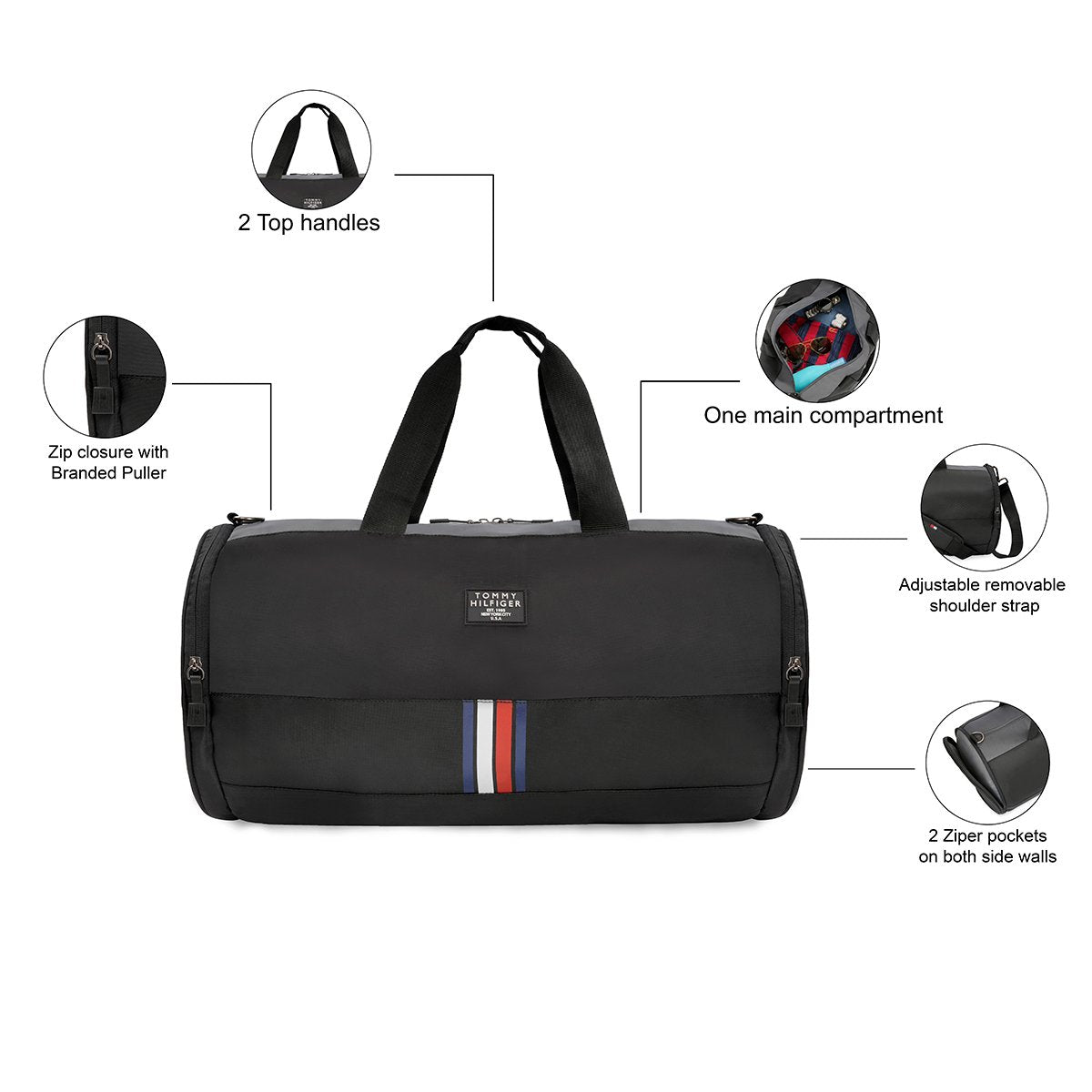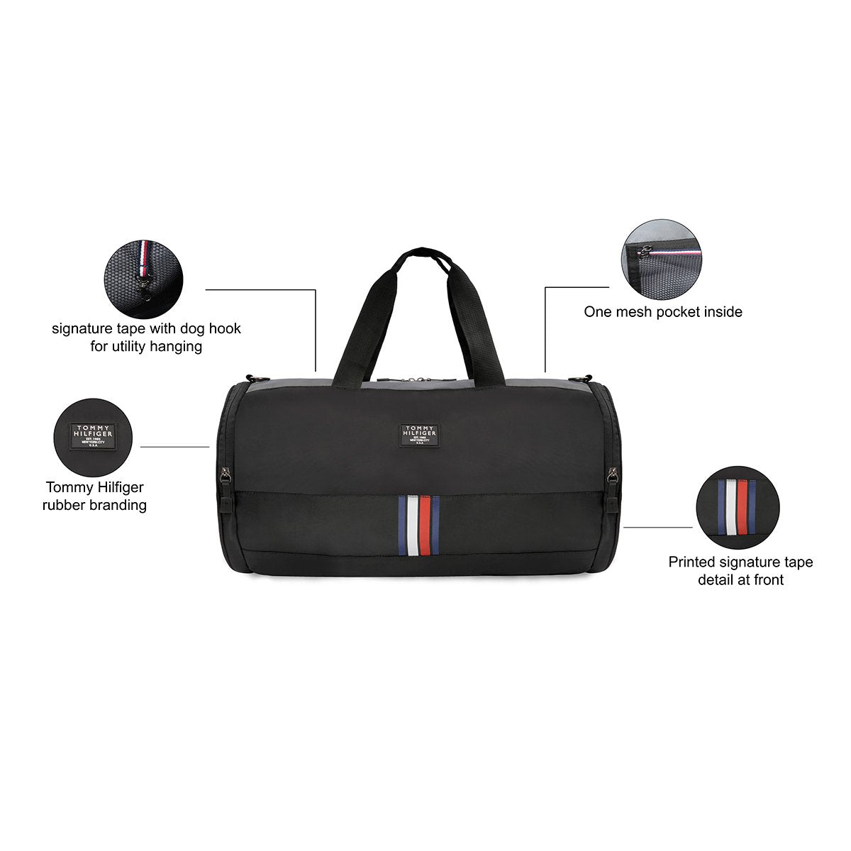 Introducing the Tommy Hilfiger Ural Duffle Gym Bag – a stylish and functional companion for your active lifestyle. Crafted from water-resistant polyester fabric, this gym bag ensures durability. The secure zipper closure, adjustable strap, and single compartment offer convenient access. Featuring a Tommy Hilfiger flag print branding at the front, the Ural Duffle Gym Bag stands out with its distinctive style. The perfect size, coupled with one pocket, makes it an ideal choice for your gym essentials. Elevate your workout routine with the Ural Duffle.