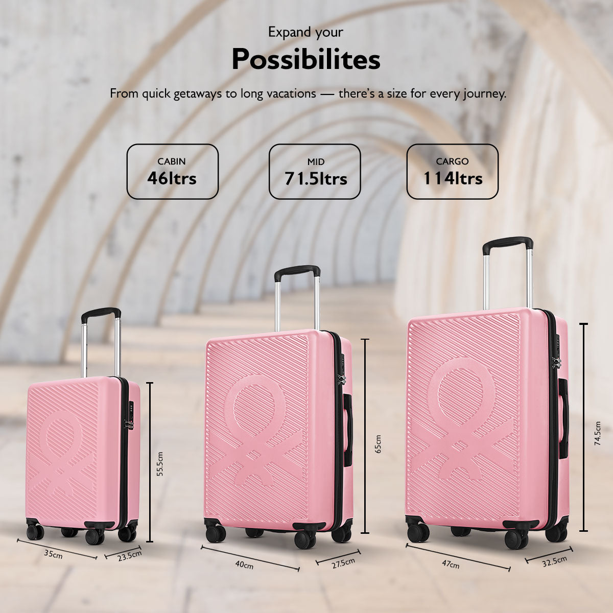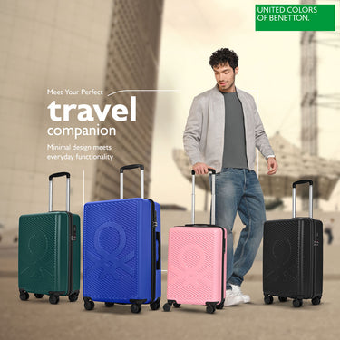 Equipped with branded wheels for effortless movement, making this trolley a sleek and reliable companion for every journey. ited Colours of Benetton Glide Hard Luggage