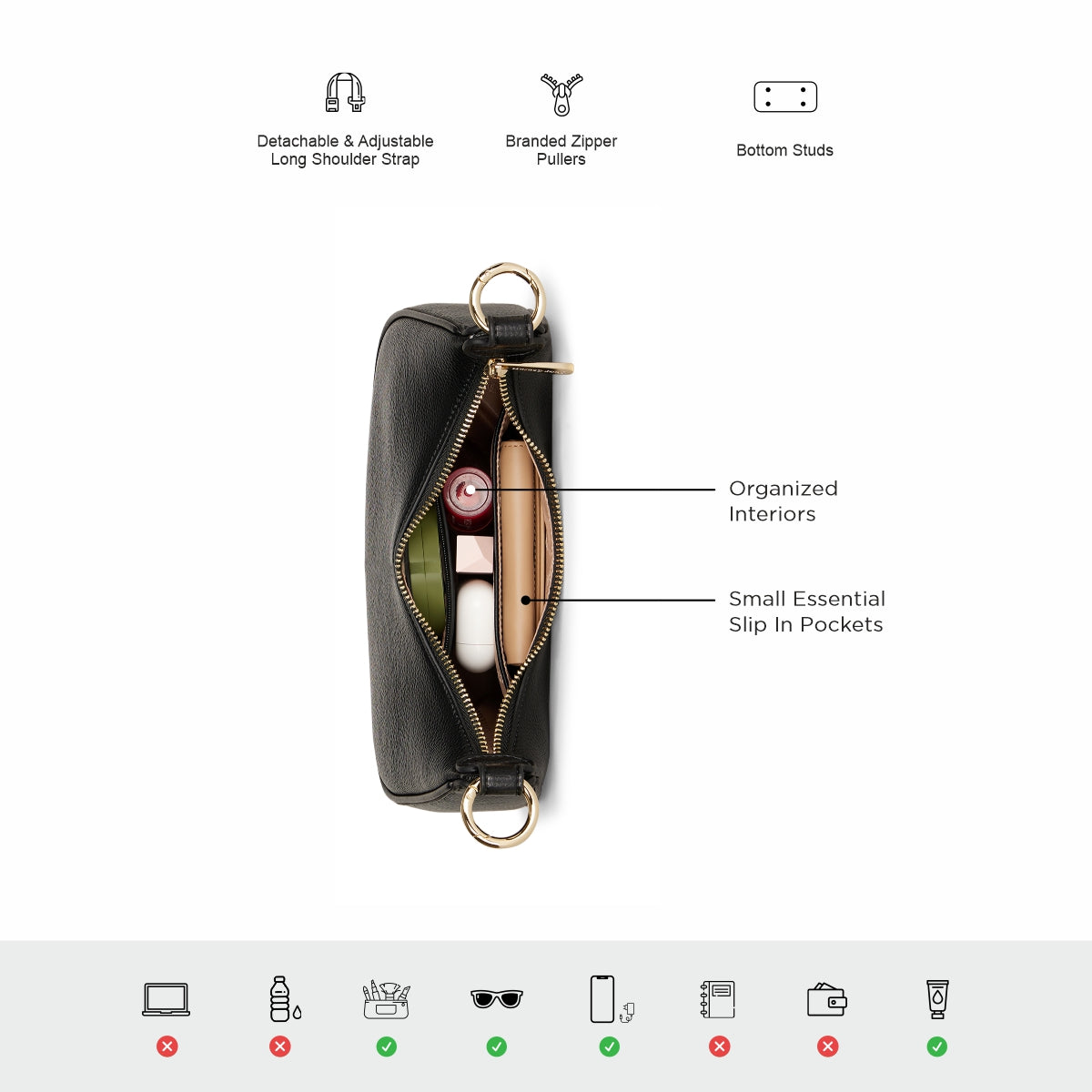 Crafted from pebbled PU with signature branding and polished bottom studs, this bag brings bold Style in a compact silhouette. The versatile chain strap and detachable long shoulder strap let you switch up your look with ease.