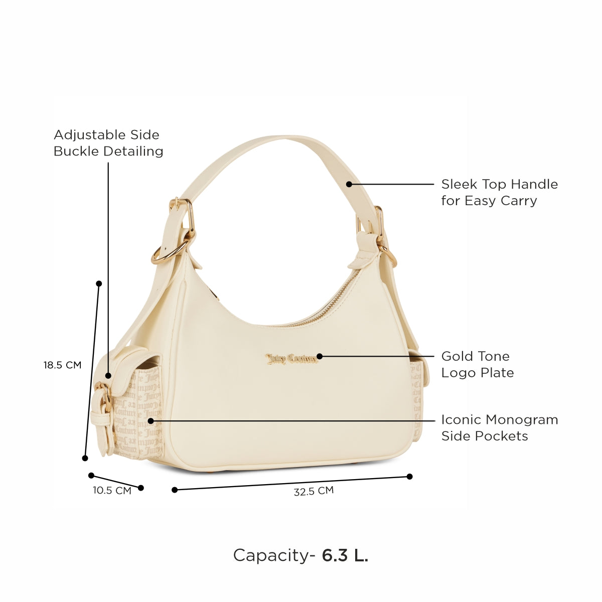 - Signature Juicy Branding – Showcases a gold-tone logo plate on the front, paired with iconic monogram side pockets that add a glamorous and instantly recognizable Juicy Couture touch.