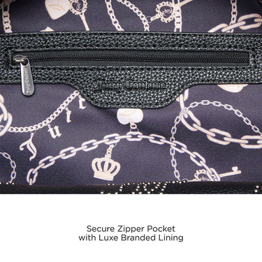 Sophisticated Juicy Couture Elegance: Flaunt the luxe pebbled texture PU and signature branding, complemented by statement initials bead branding, epitomizing Juicy Coutures iconic charm.