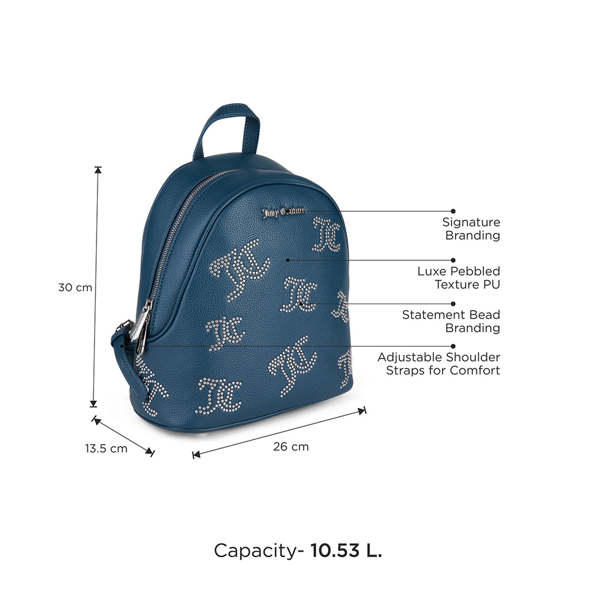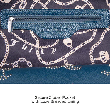 Sophisticated Juicy Couture Elegance: Flaunt the luxe pebbled texture PU and signature branding, complemented by statement initials bead branding, epitomizing Juicy Coutures iconic charm.