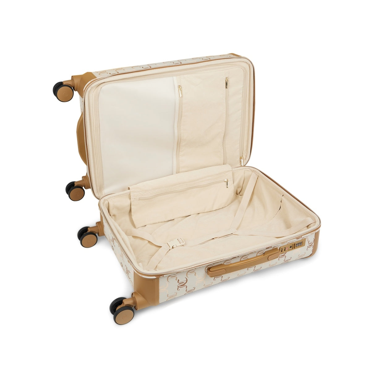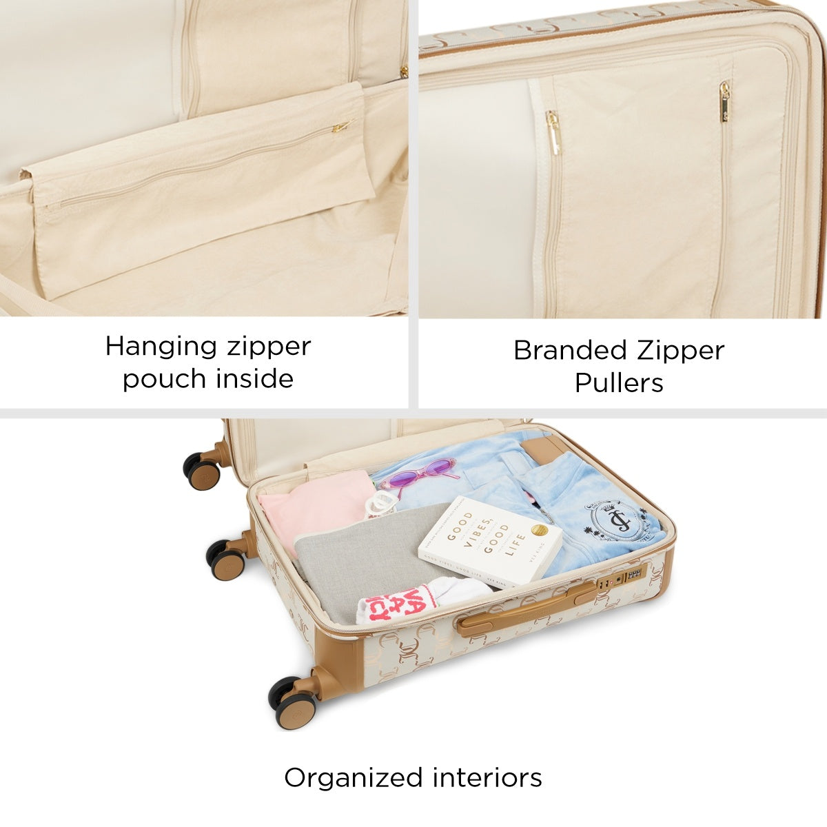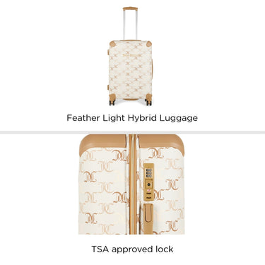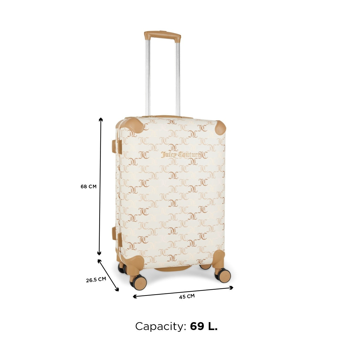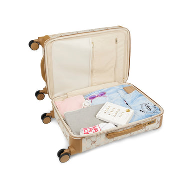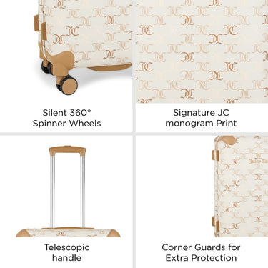 - Iconic on the Outside: Wrapped in a water-resistant polycarbonate shell with corner guards for that extra oomph, this stunner flaunts the signature JC monogram print and branded zipper pullers—because every detail deserves a little drama.