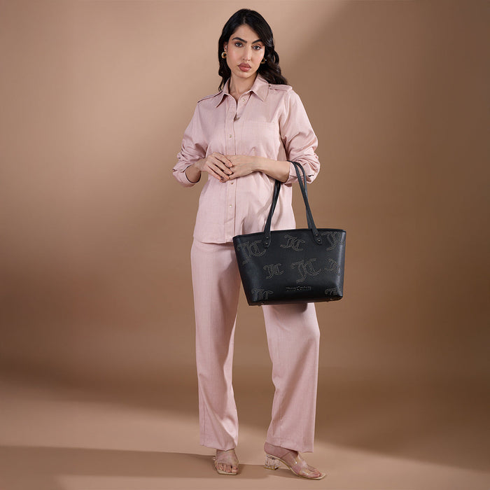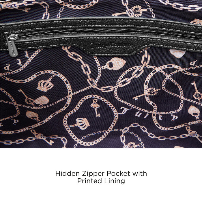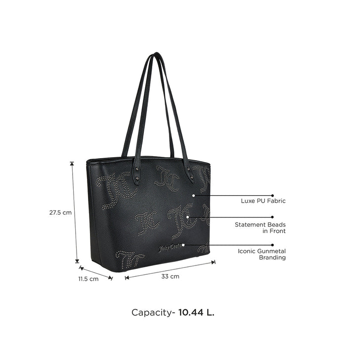Distinctive Juicy Couture Design: Flaunt your style with a unique rectangular silhouette featuring a curved top, statement beads in front, and iconic gunmetal branding, epitomizing Juicy Coutures chic elegance.