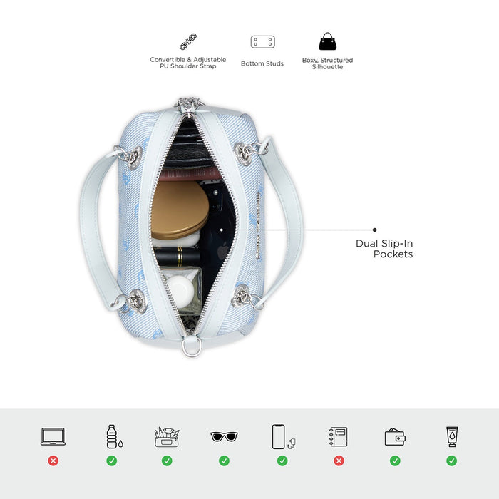 Effortless Functionality: Enjoy easy access with the easy-grab PU handle, chunky charm zipper detail, convertible and adjustable PU shoulder belt, dual slip-in pockets, and secure zipper pocket with chunky ‘J’ hanging.