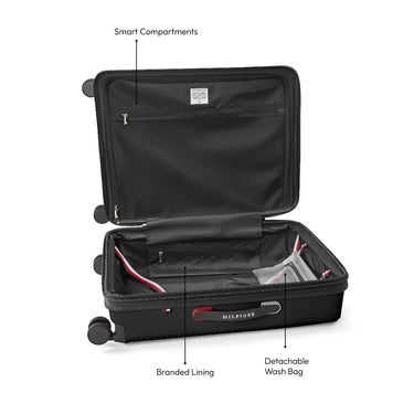 Signature Sophistication: Elevate your journeys with iconic Tommy Hilfiger styling — from the sleek UV-printed logo to the soft silicone RWB badge and contrast-accented grab handles that blend heritage with modern flair.