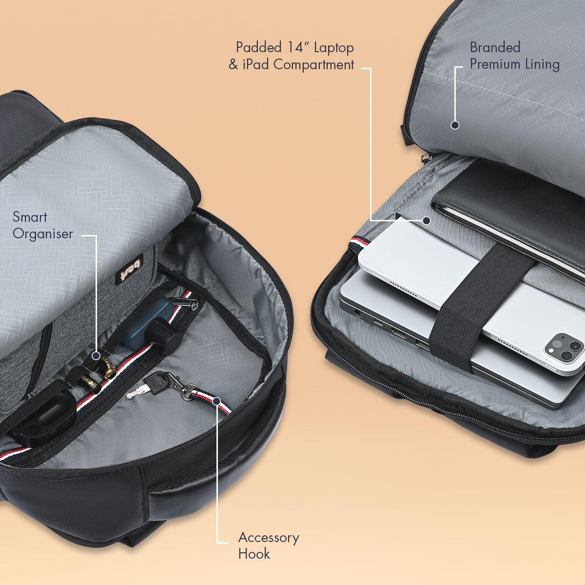 - Smart Interior Organization: Features a padded laptop and iPad compartment, internal metal dog hook, and neatly arranged organiser pockets for secure and efficient storage.