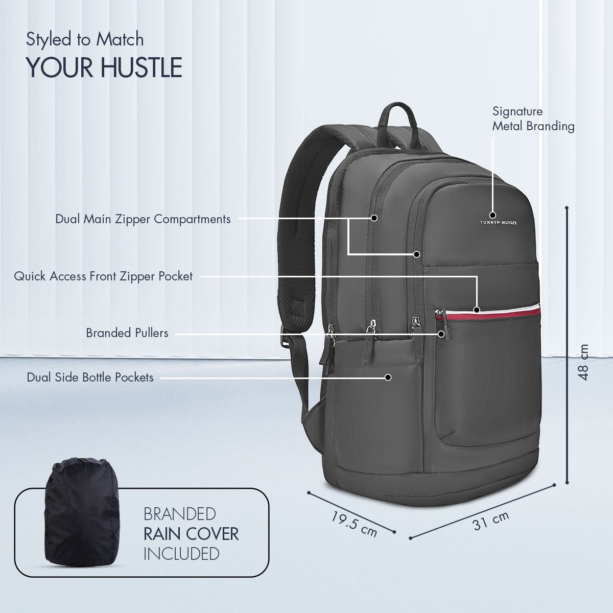 Crafted from premium water-resistant fabric, this backpack is designed to handle unpredictable weather with ease. Whether you're commuting through drizzle or traveling in downpours, the included branded rain cover offers full protection while maintaining a sleek, stylish look.