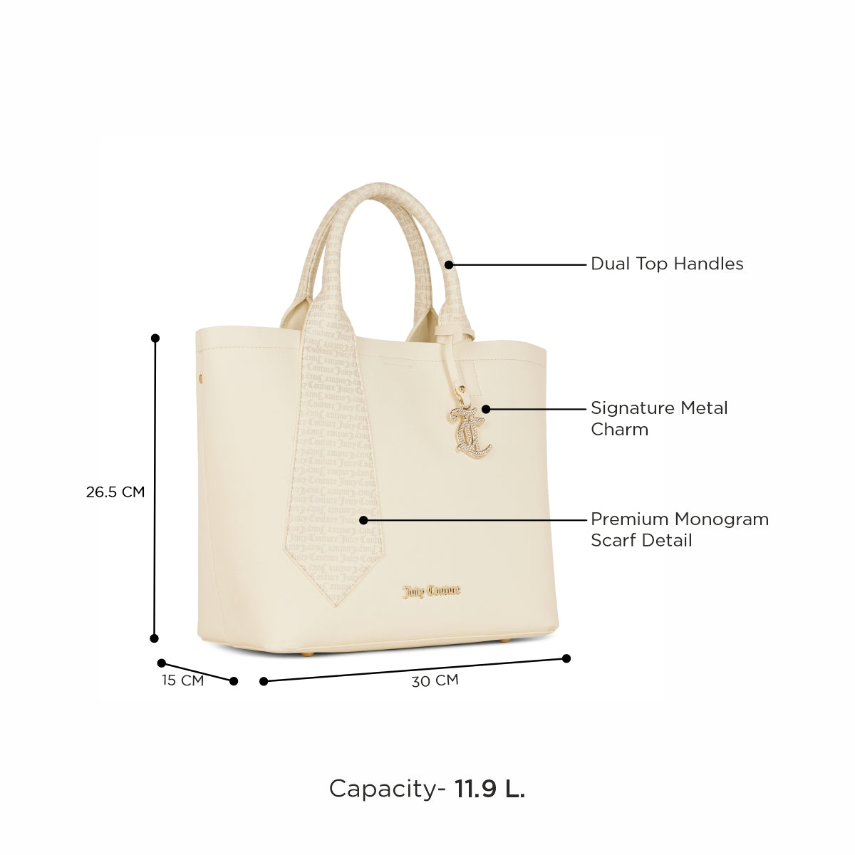 - Signature Juicy Detailing – Features a premium monogram scarf accent and a signature metal charm, adding a glamorous touch that embodies Juicy Couture’s iconic style.