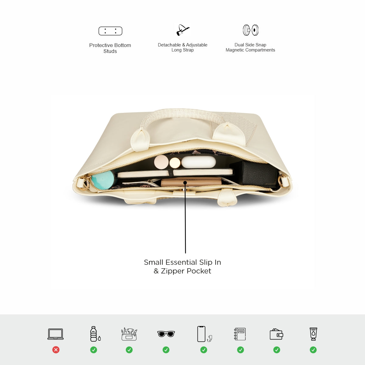 - Versatile & Functional – Includes a detachable and adjustable long strap for hands-free convenience, while protective bottom studs provide structure and safeguard the bag when placed down.