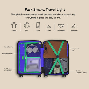 Smart Interior Design: Features spacious and organized compartments with premium branded lining, a compression belt, mesh pocket for essentials, PVC wet pocket for damp items, and a hanging pouch—ensuring everything has its place.