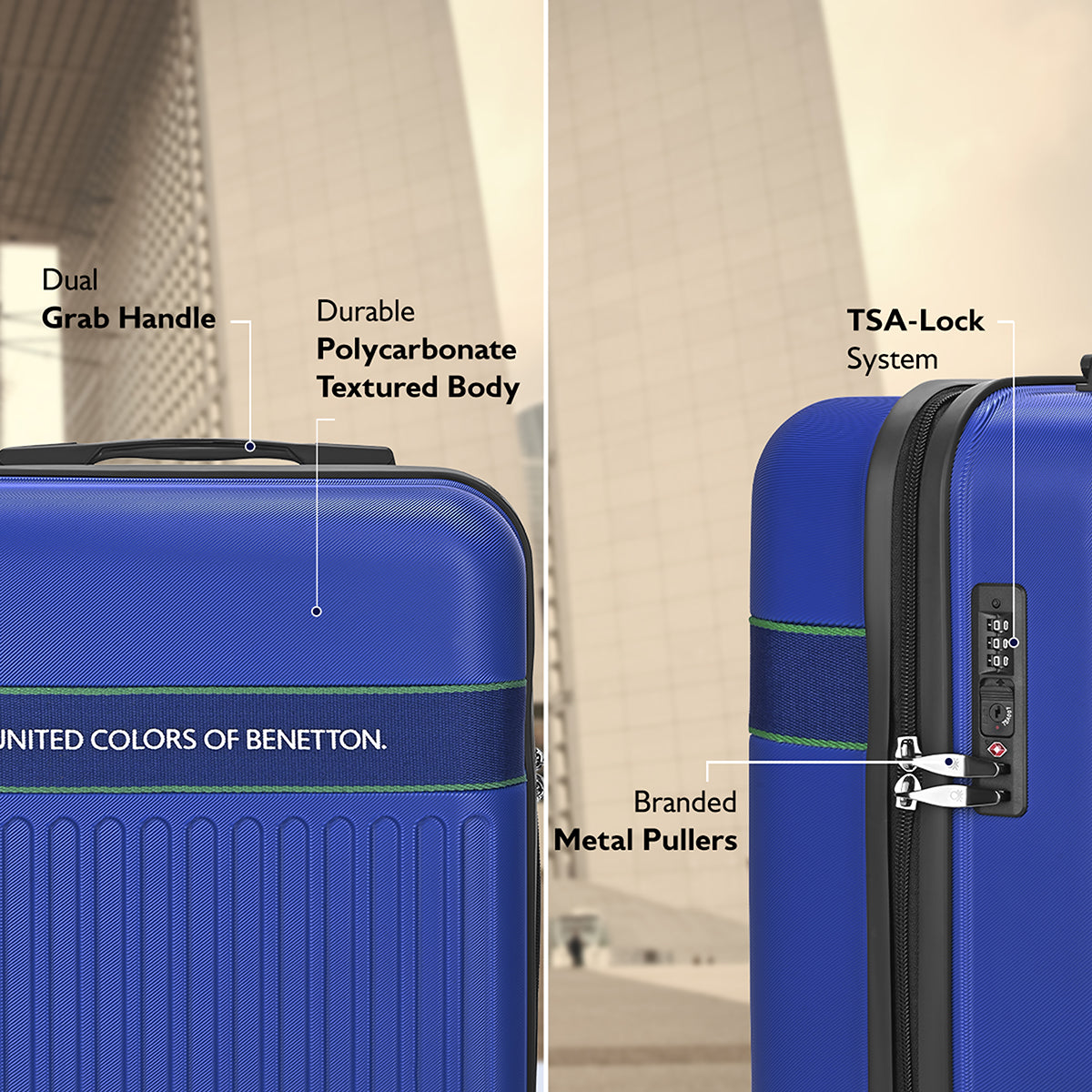 Durable & Stylish Exterior: Crafted from textured polycarbonate for enhanced durability and a sleek look, complemented by branded webbing and metal pullers that add a refined, premium touch.
