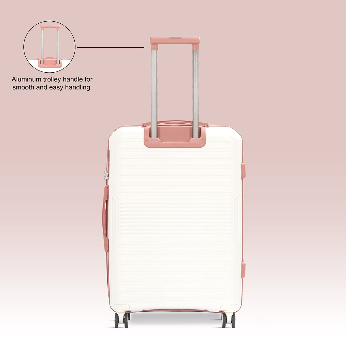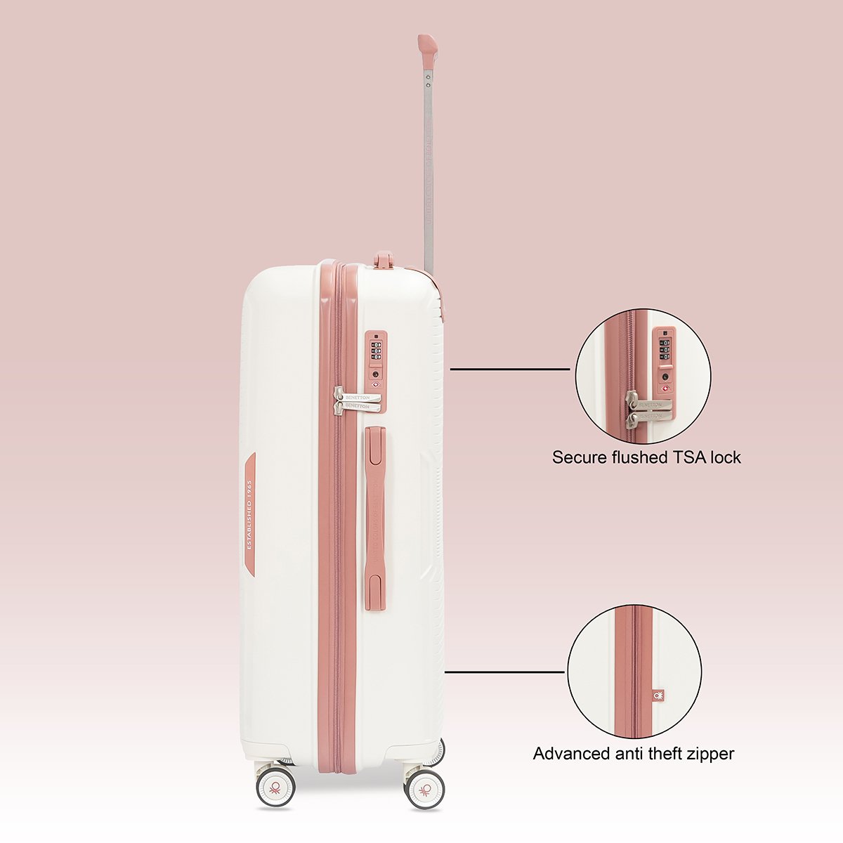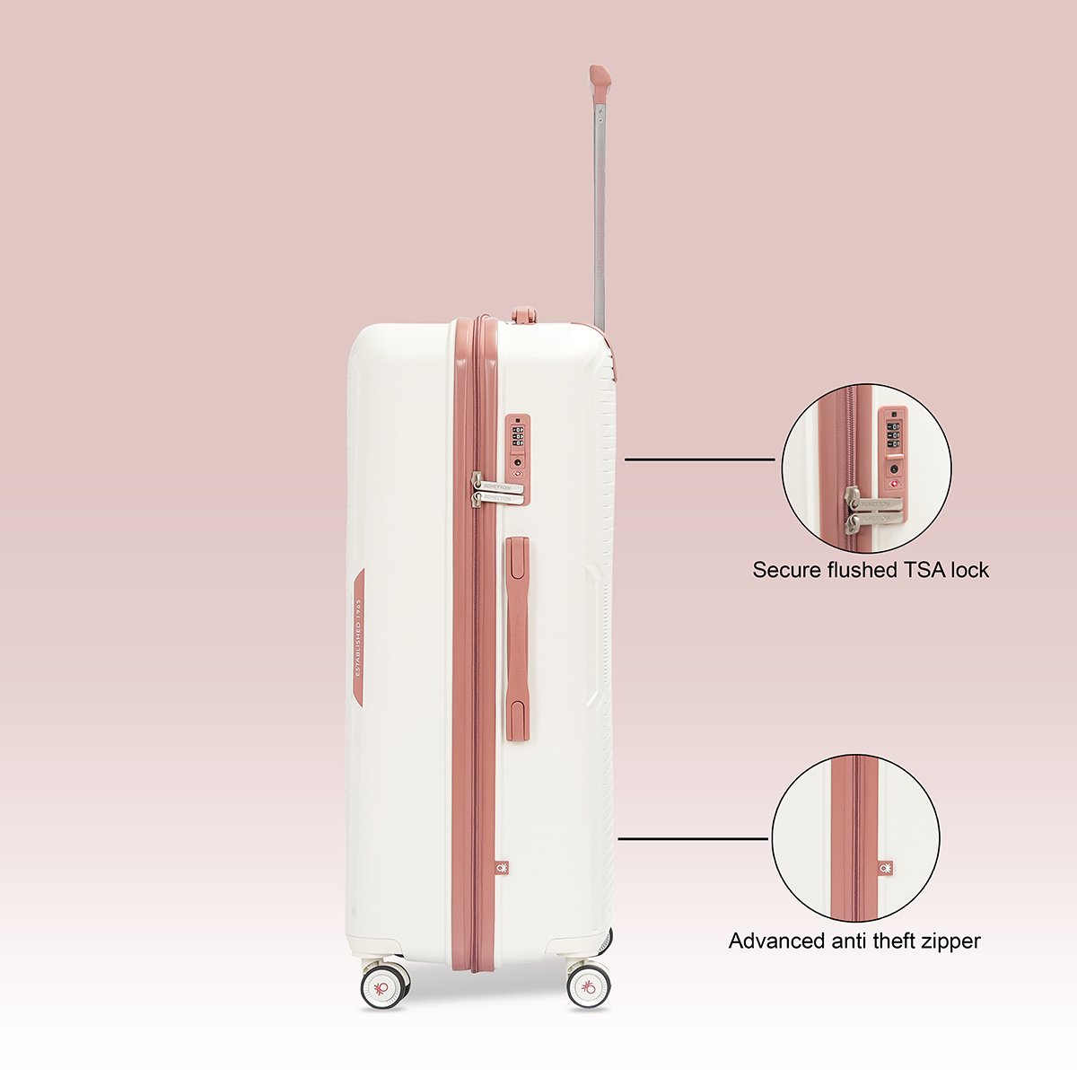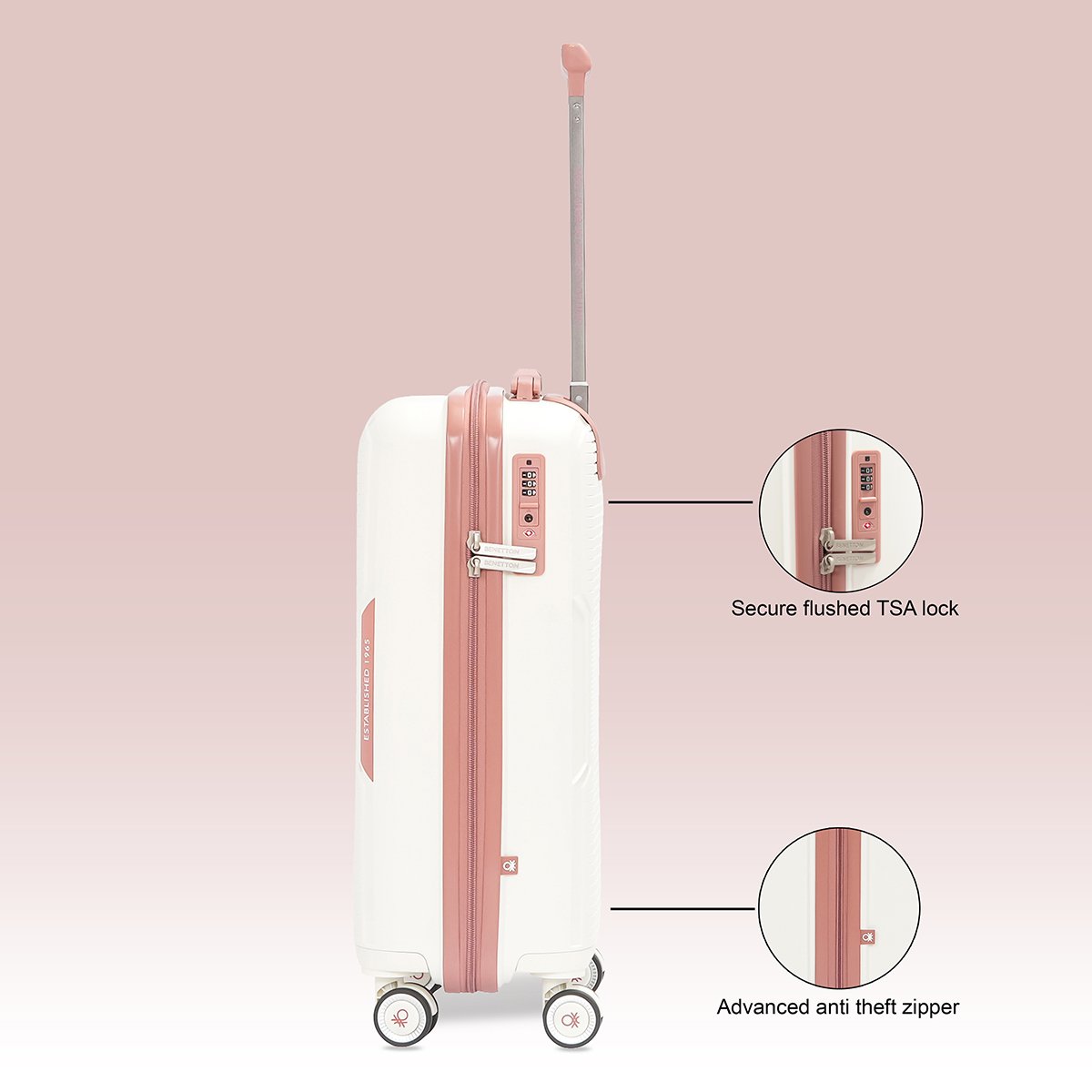 This luggage is not only functional but also practical, with two compartments, three pockets, and eight zips in total, allowing you to organize your belongings efficiently. The eight double-wheeled design ensures smooth mobility, making it effortless to navigate through crowded airports or busy streets.