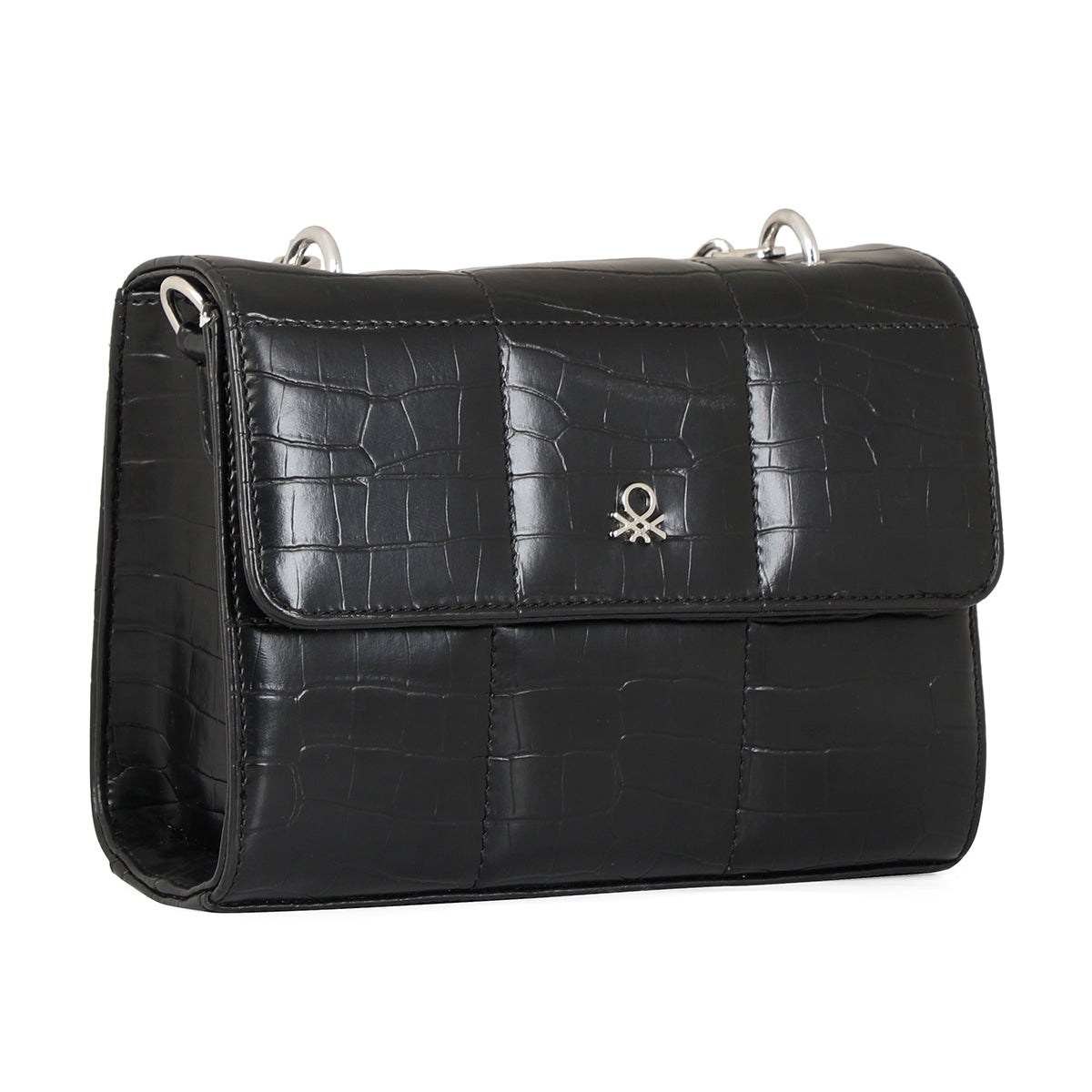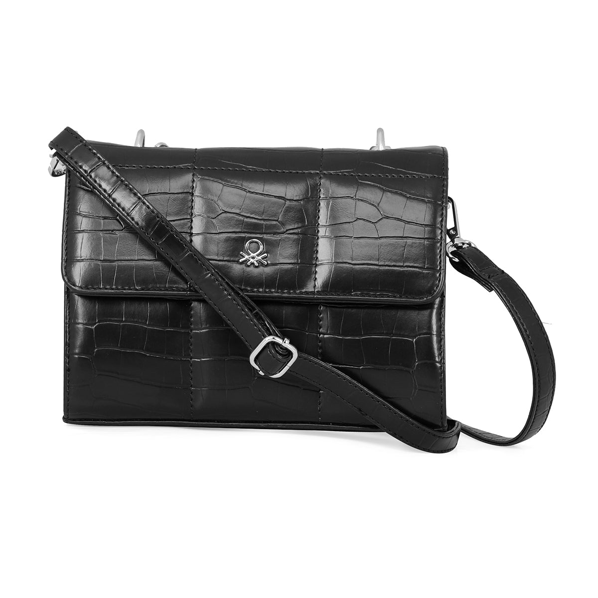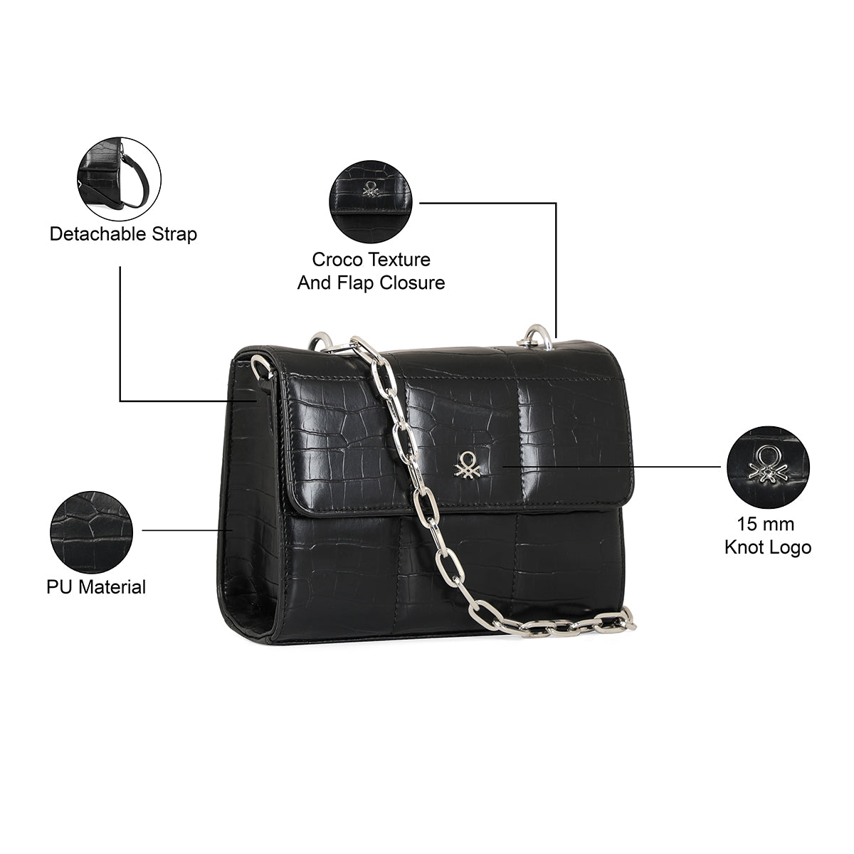 Unveil a touch of elegance with the Candace Sling from the prestigious United Colors of Benetton. This sling bag, with its croco-textured pattern, is a blend of style and functionality. The shiny nickel trim adds a dash of sophistication, while the flap closure ensures your belongings are secure. Crafted from premium PU, the bag's interior, lined with durable polyester twill, features one zip and two inner pockets for organized storage. The detachable PU strap offers versatility in styling. Adorned with a 15-inch UCB logo and a unique knot logo, the Candace Sling is a testament to Benetton's commitment to unparalleled style and quality.