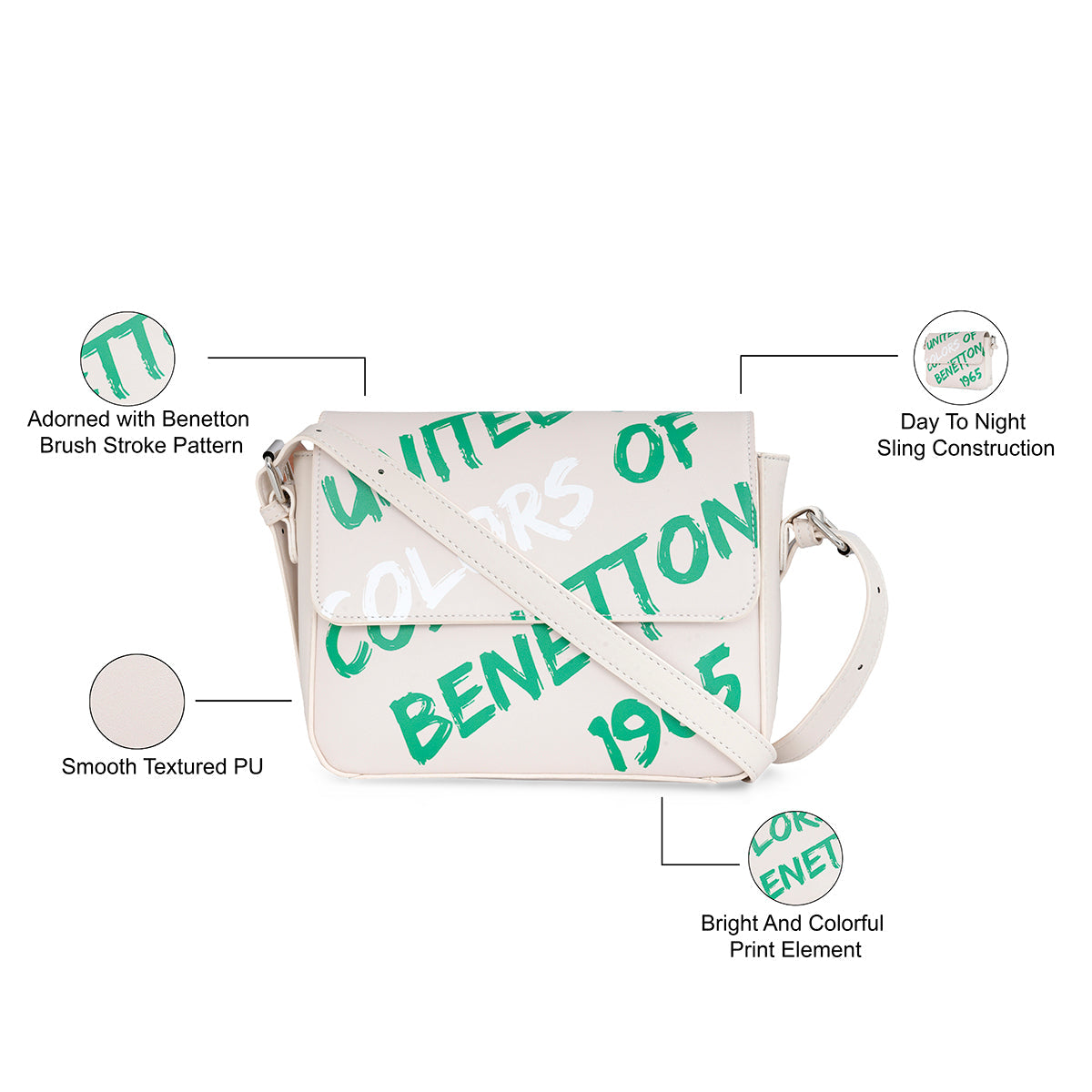 Embrace glam and chic with the United Colors of Benetton Rylie Sling, a perfect companion to elevate your look. Made from durable PU material, this sling bag features a Benetton print that adds a touch of iconic charm. The cotton lining along with the detachable flap closure offers comfort and versatility in styling. With one spacious compartment and a pocket, the Rylie Sling provides just the right amount of storage for your essentials. The shiny nickel trim adds a modern touch to the design, enhancing its overall elegance.