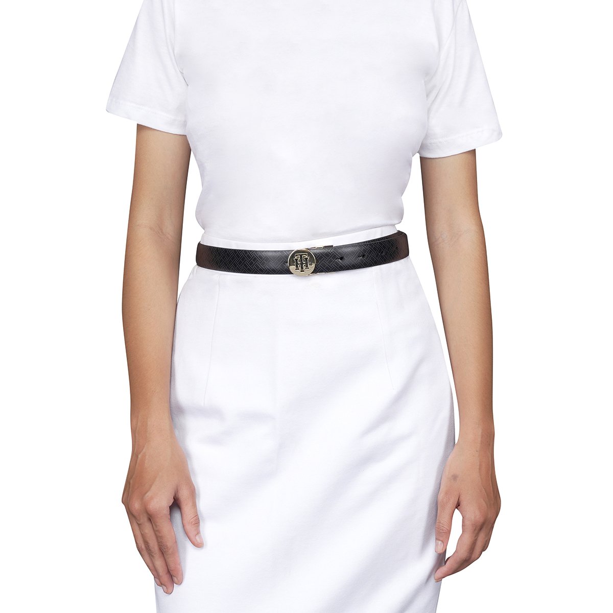 Iconic Round Buckle: Featuring the iconic Tommy Hilfiger brand round buckle, this belt is a symbol of timeless style. The prong closure ensures a secure fit, blending practicality with chic design.