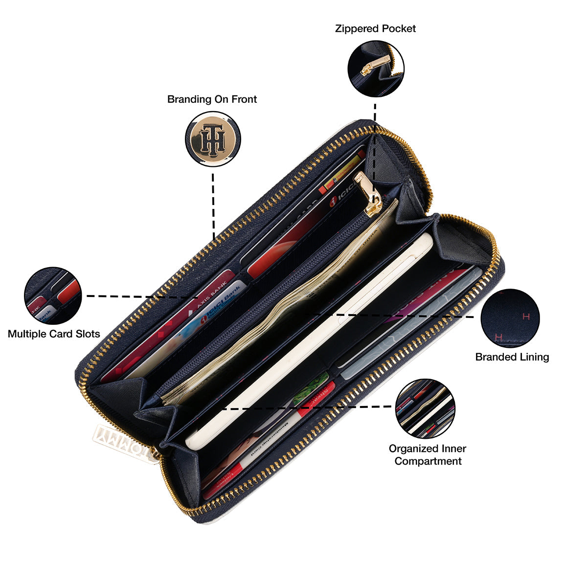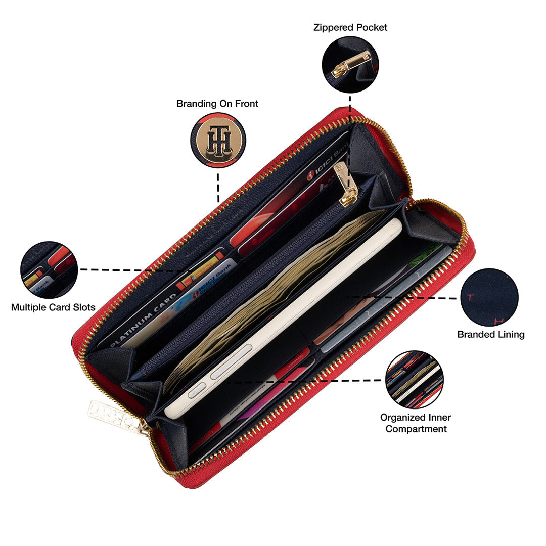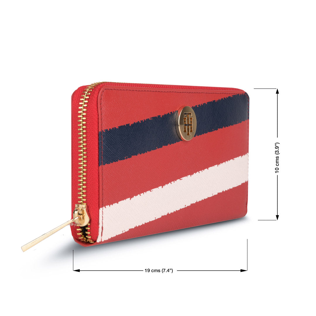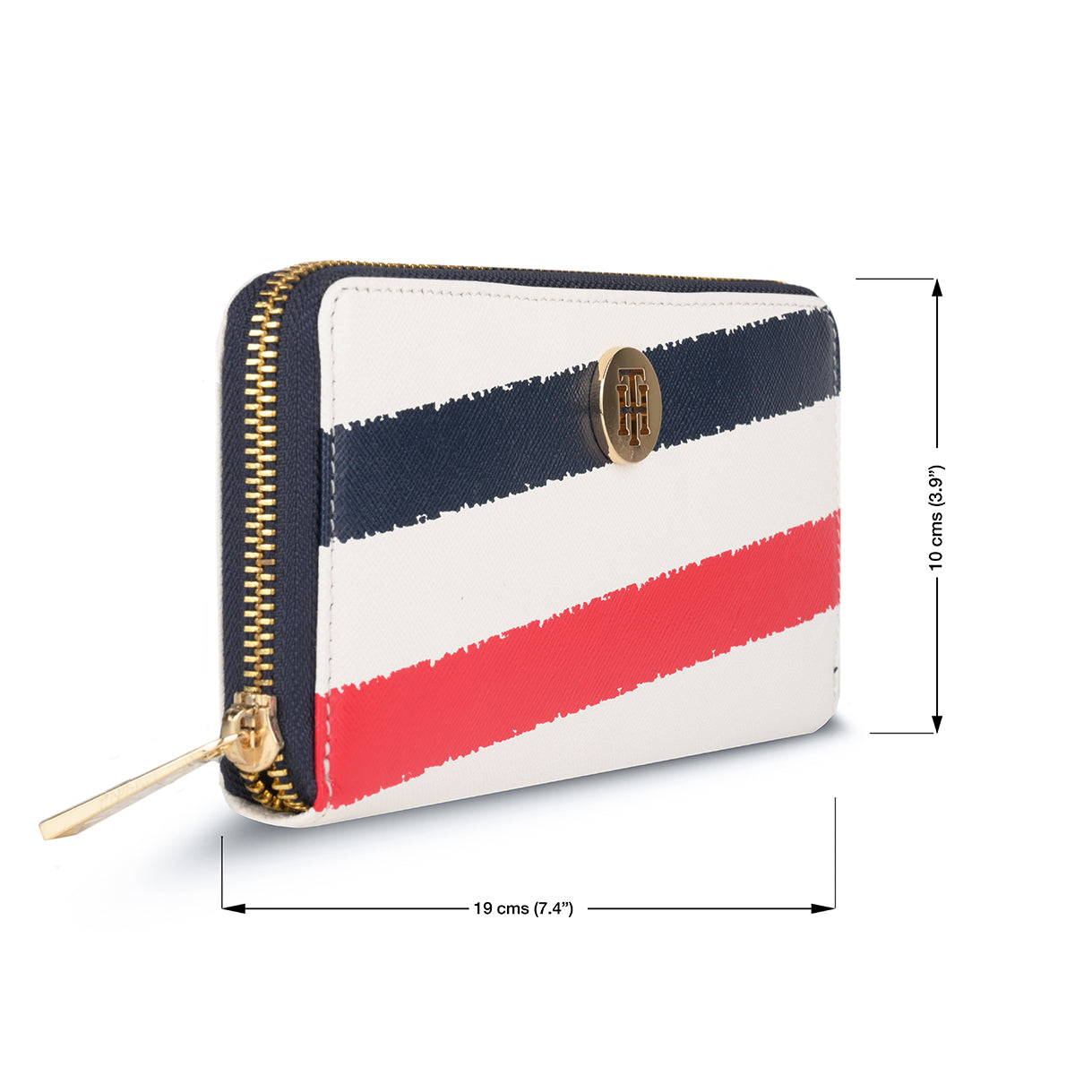 Tommy Hilfiger Adore wallet features creative strokes with signature Tommy Hilfiger hues. This wallet is an embodiment of classical design with the modern strokes of colors. The contemporary wallet can store all the small daily essentials easily as it features spacious compartments.