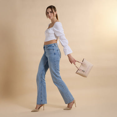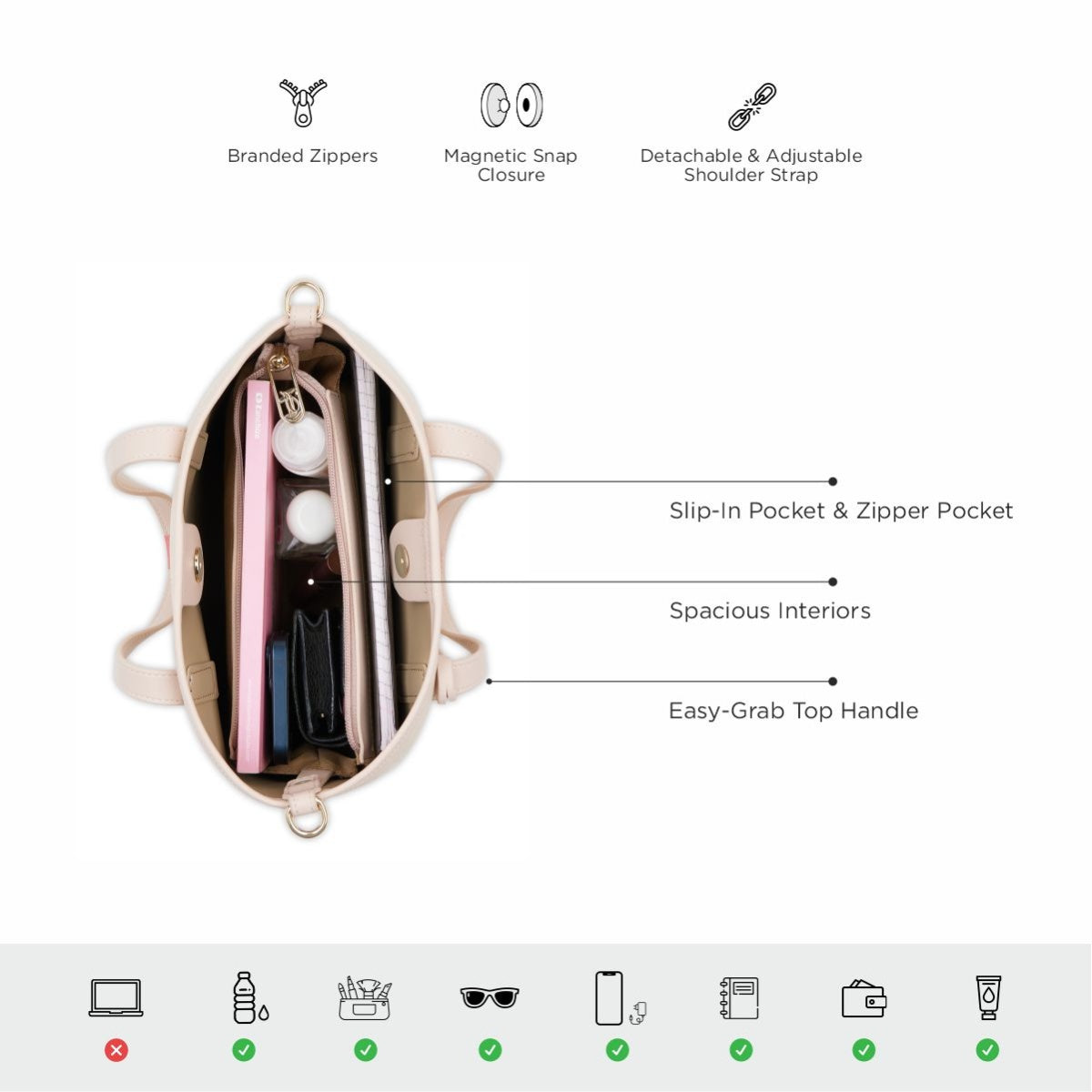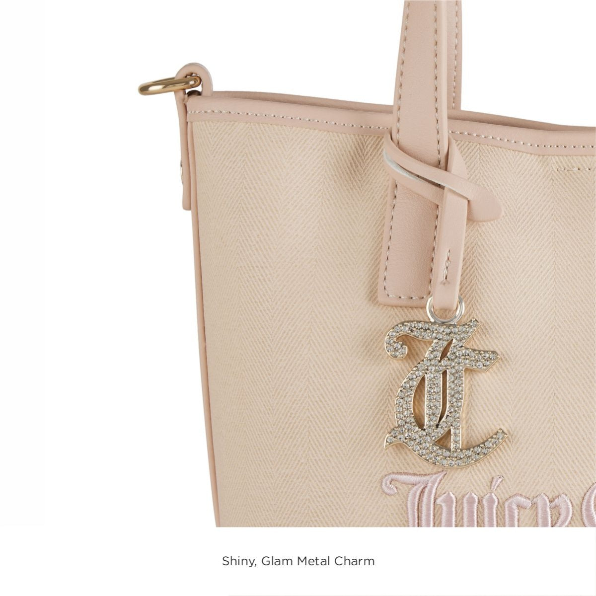 Convenience & Style: Enjoy quick access with an easy-grab top handle, magnetic snap closure, and smooth branded zipper, all enhanced by a shiny, glam metal charm.