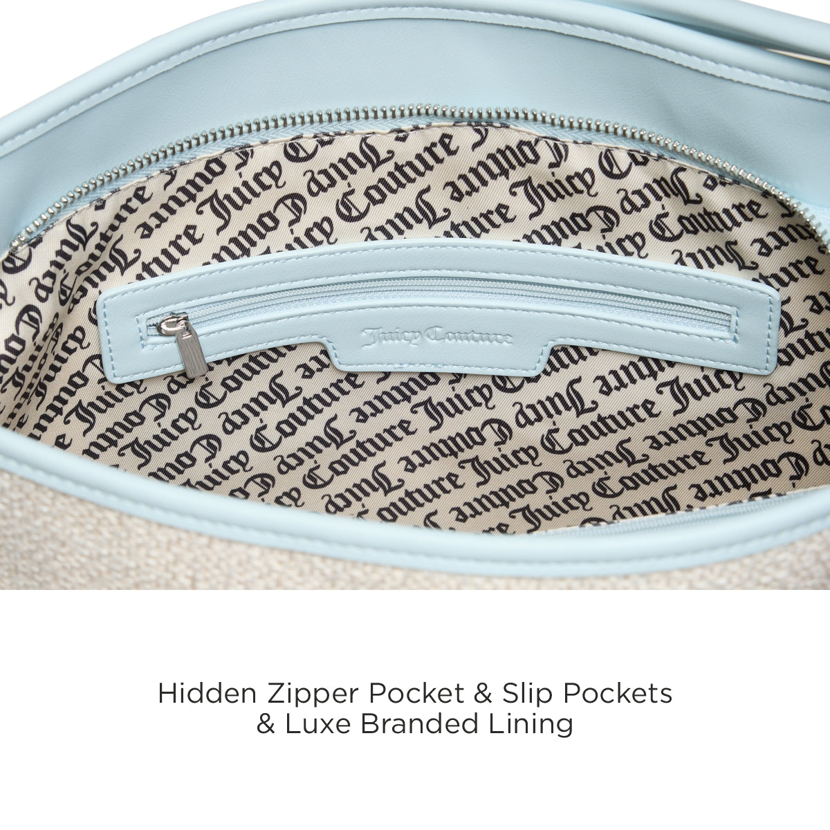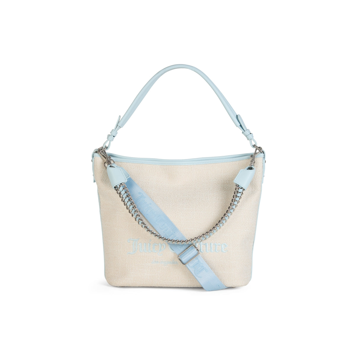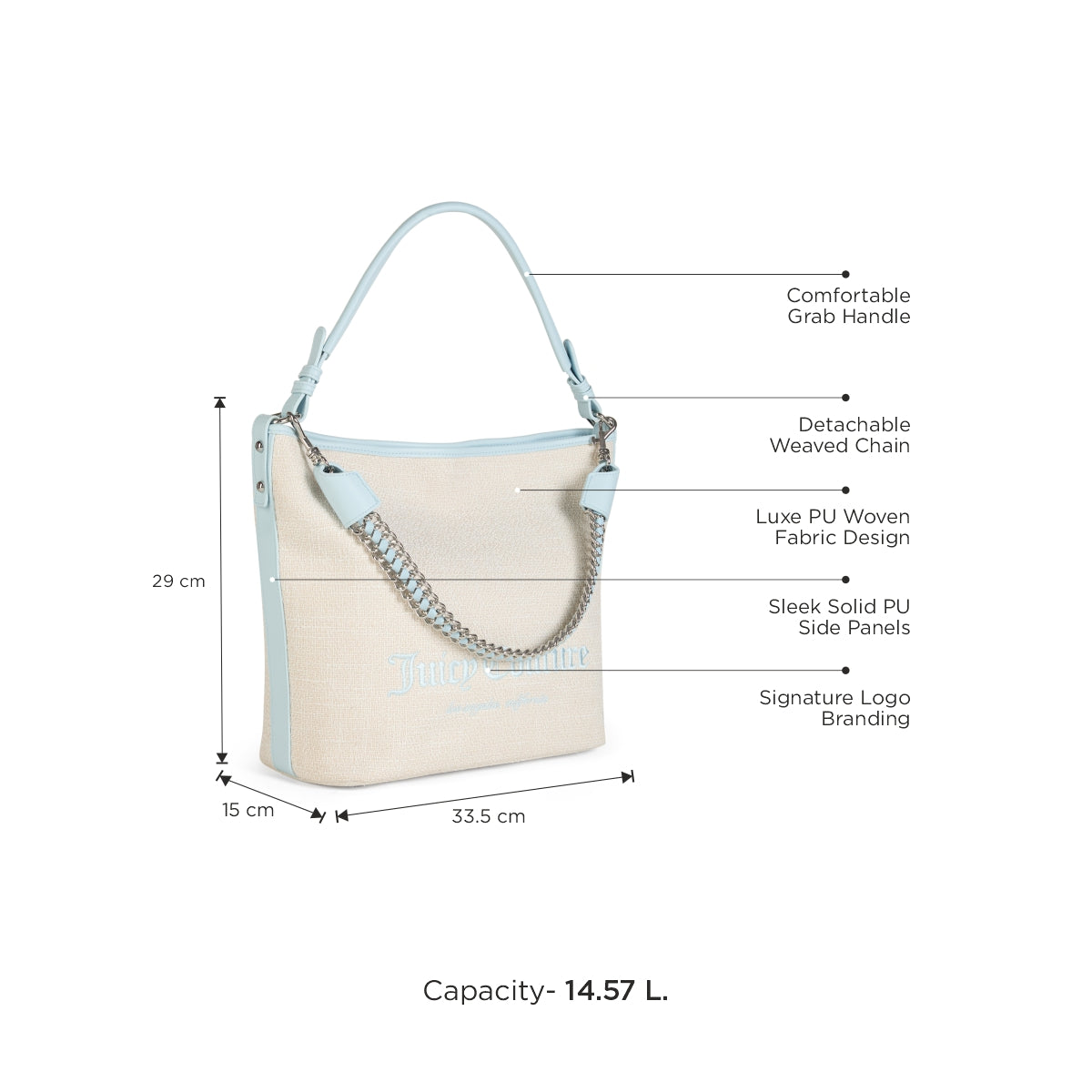 Sophisticated Juicy Couture Look: Elevate your style with the PU woven fabric design and signature JC logo branding in front, complemented by the sleek solid PU side panels for a chic, polished appearance.