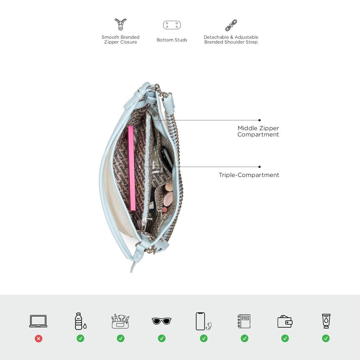 Organized Elegance: Stay effortlessly organized with three compartments, a middle zipper compartment, hidden zipper pocket, dual slip-in organizers, smooth branded zipper, and bottom studs for support, ensuring a blend of practicality and style.