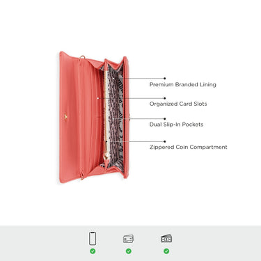 It’s not just a pretty face. Open it up to reveal a premium branded lining, thoughtfully designed card slots, dual slip-in pockets, and a zippered coin compartment — all crafted to keep your essentials perfectly in place while looking effortlessly organized.