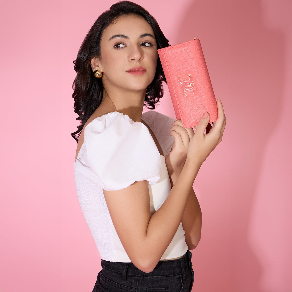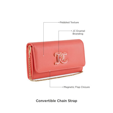 Make a bold statement with every carry. This wallet features a rich pebbled texture and our signature ‘JC’ enamel branding that adds instant recognition and glam. The sleek magnetic flap closure, paired with gold-finished metal accents, gives it that elevated, polished look you’ll love — classic Juicy with a luxe twist.