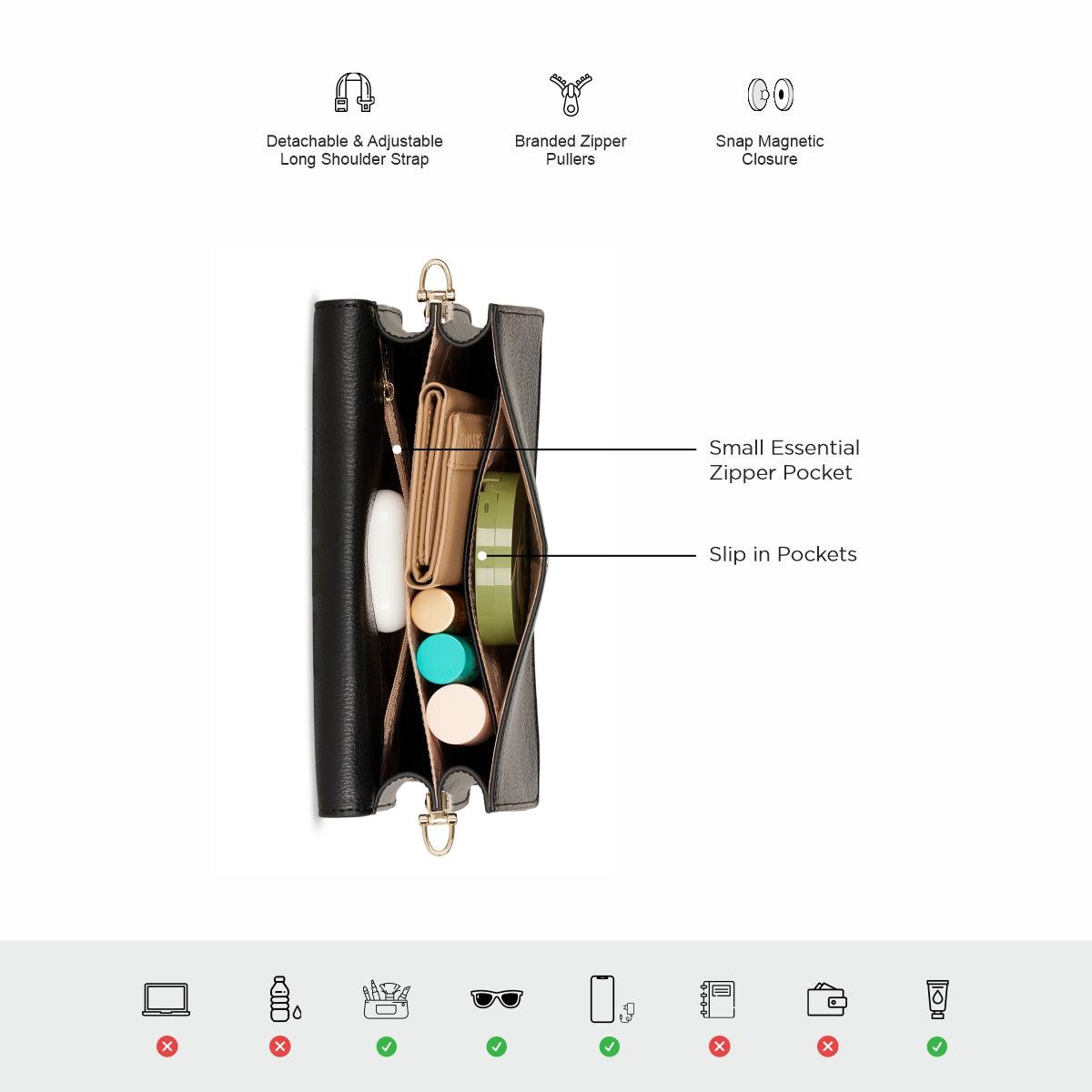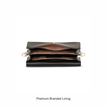 A snap magnetic closure opens to reveal premium branded lining, slip-in compartments, and a zippered pocket for small essentials—because staying organized should always look this good.