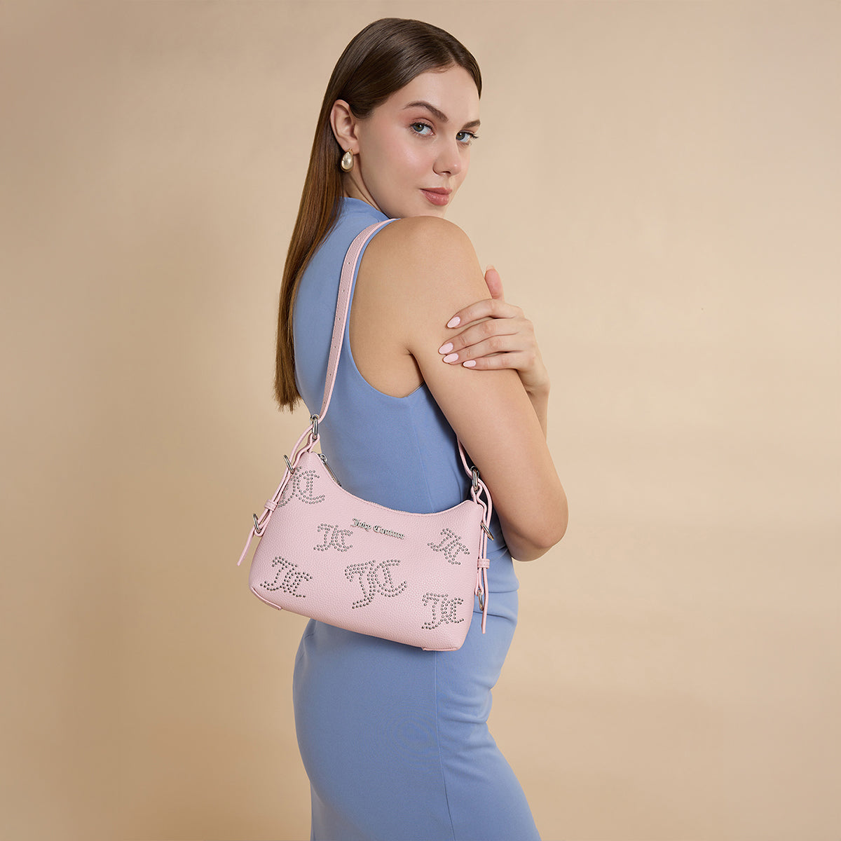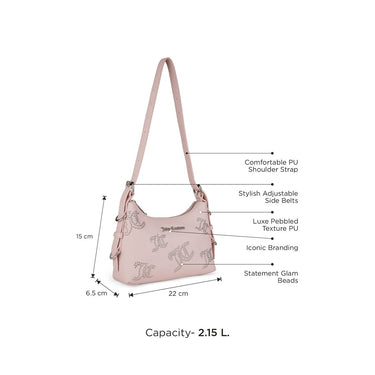 Sophisticated Juicy Couture Flair: Elevate your style with luxe pebbled texture PU, iconic front branding, and statement beads for added glam, embodying Juicy Coutures chic elegance.