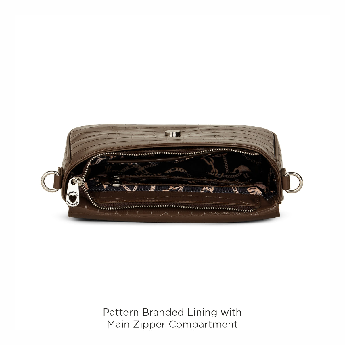 - Luxurious Croc-Textured Finish – Crafted from premium PU with a luxe croc-textured surface, the bag exudes sophistication and durability, complemented by a patterned branded lining inside.