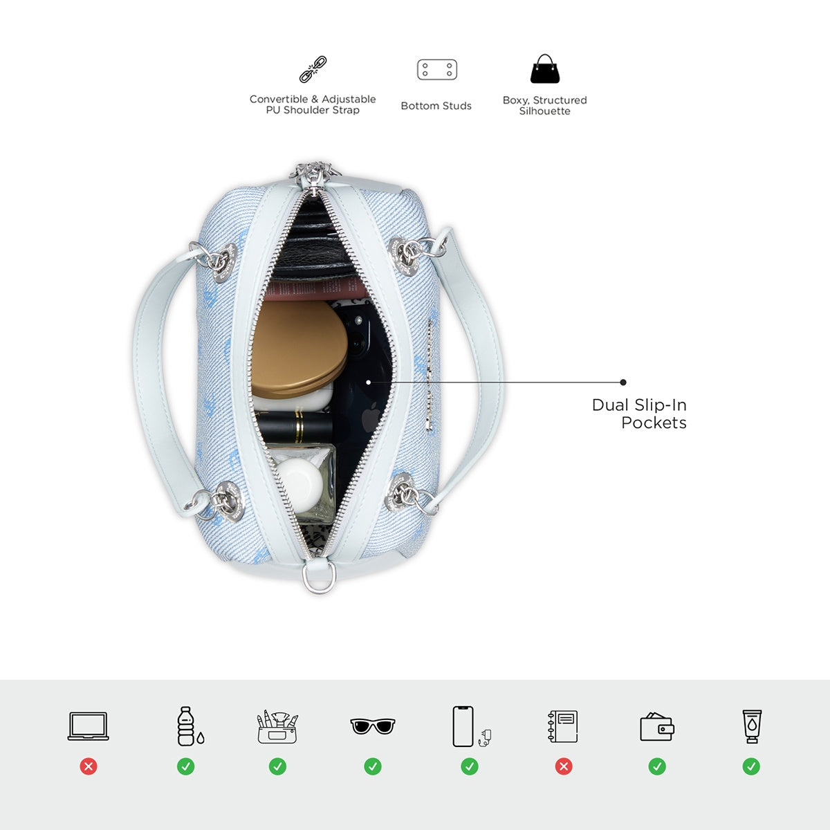 Compact & Practical: Benefit from the sleek bottom studs for support, branded lining inside, and a compact, convenient design that effortlessly blends fashion and utility.