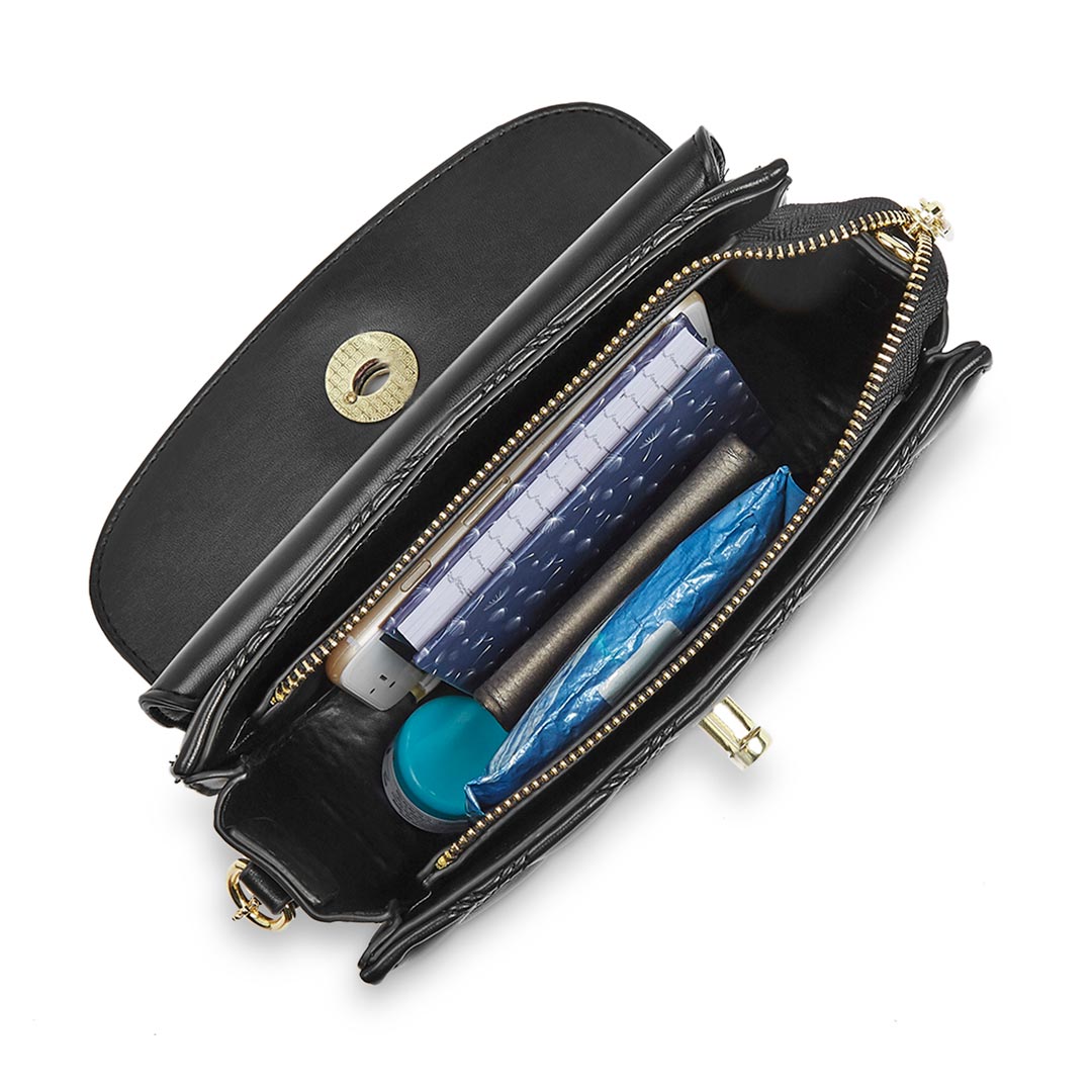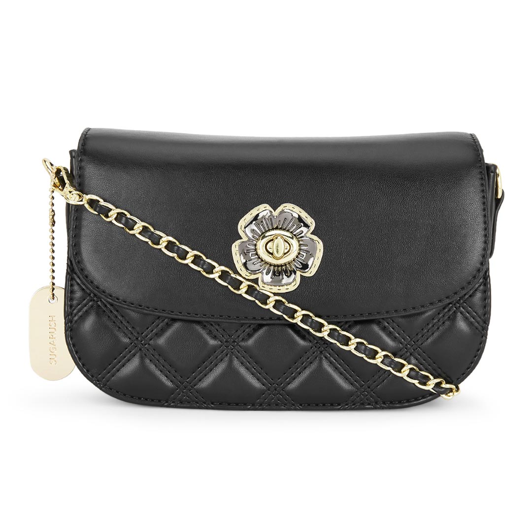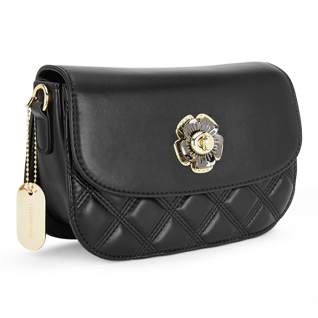 The Sugarush Maci sling bag features a quilted and timeless pattern. The vegan leather accentuates the next-gen element along with a floral enamel lock and metal sling. A spacious sling that emphasizes beauty with utility.