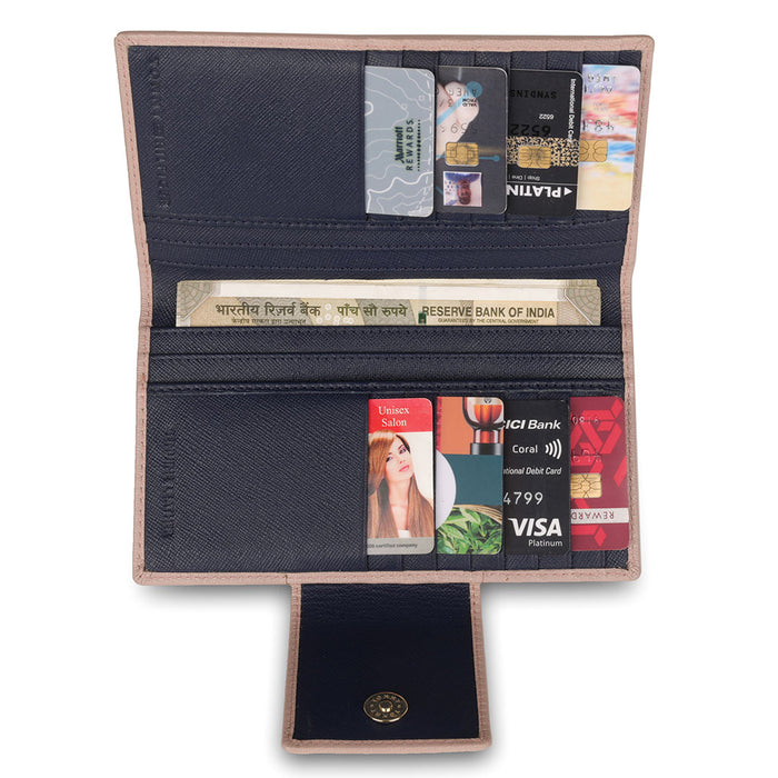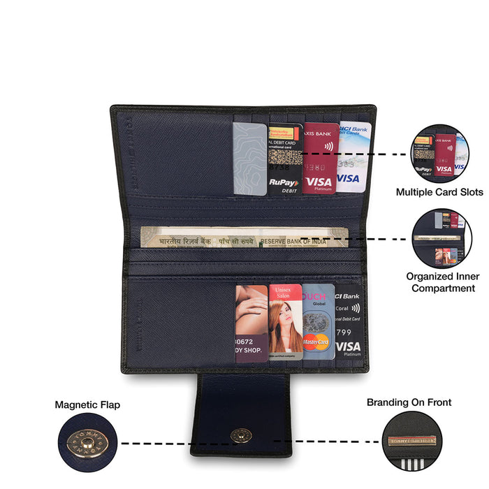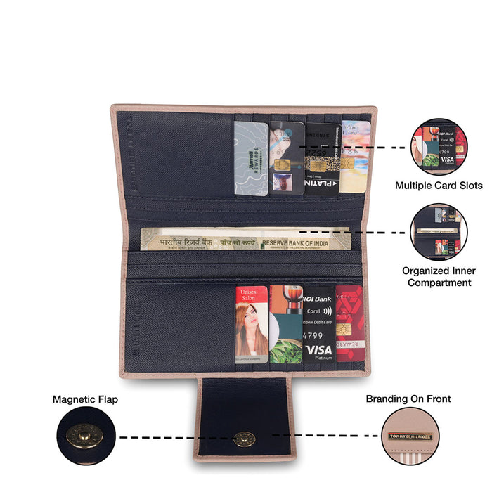 The Tommy Hilfiger Alivia Women's Leather Flap Wallet is a stylish and practical accessory. Crafted from high-quality mini Saffiano leather, this wallet features a textured design that adds sophistication to its appearance. The flap with a magnetic snap button ensures the security of your belongings. With a generous 16 card slots and six inner pockets, it offers ample space for organizing your cards and essentials. The wallet showcases the Tommy Hilfiger logo trim, representing its authentic craftsmanship. Elevate your casual style with the Alivia Flap Wallet, perfect for fashion-conscious women who appreciate both functionality and style.
