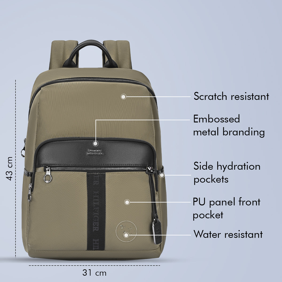- Premium Design & Signature Detailing – Crafted with a branded webbing strip, PU panel front pocket, branded zipper pullers, and embossed metal branding, this backpack reflects Tommy’s signature style with a modern, polished finish.