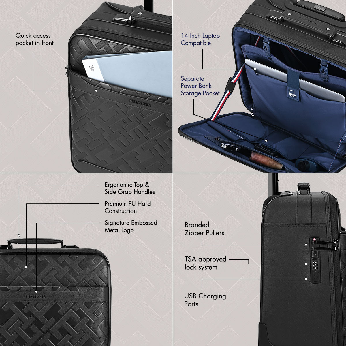 The thoughtfully planned interior features organized compartments, premium lining, and a dedicated padded section that securely fits laptops up to 14”, ensuring seamless storage of both work and travel essentials.