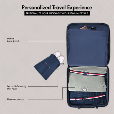 Equipped with a 2-step telescopic trolley handle and ergonomic top & side grab handles for comfortable handling. A rear customization name tag slot adds a personalized touch and ensures easy identification during travel.