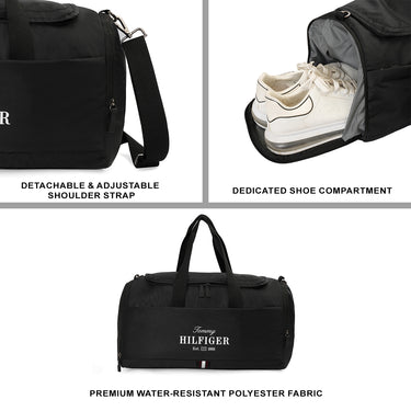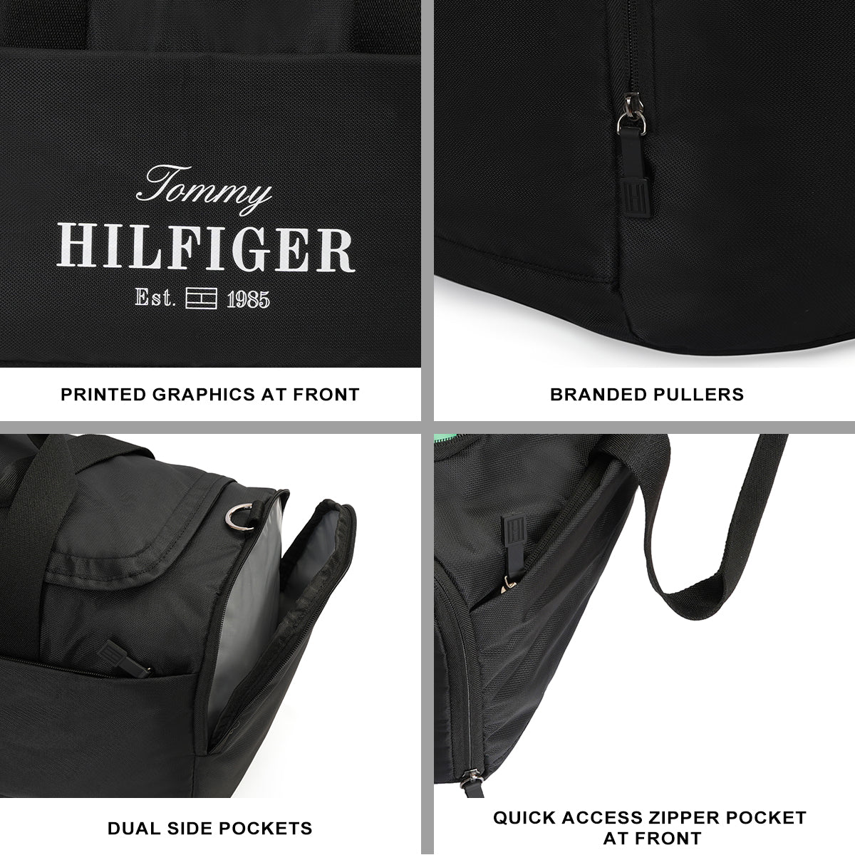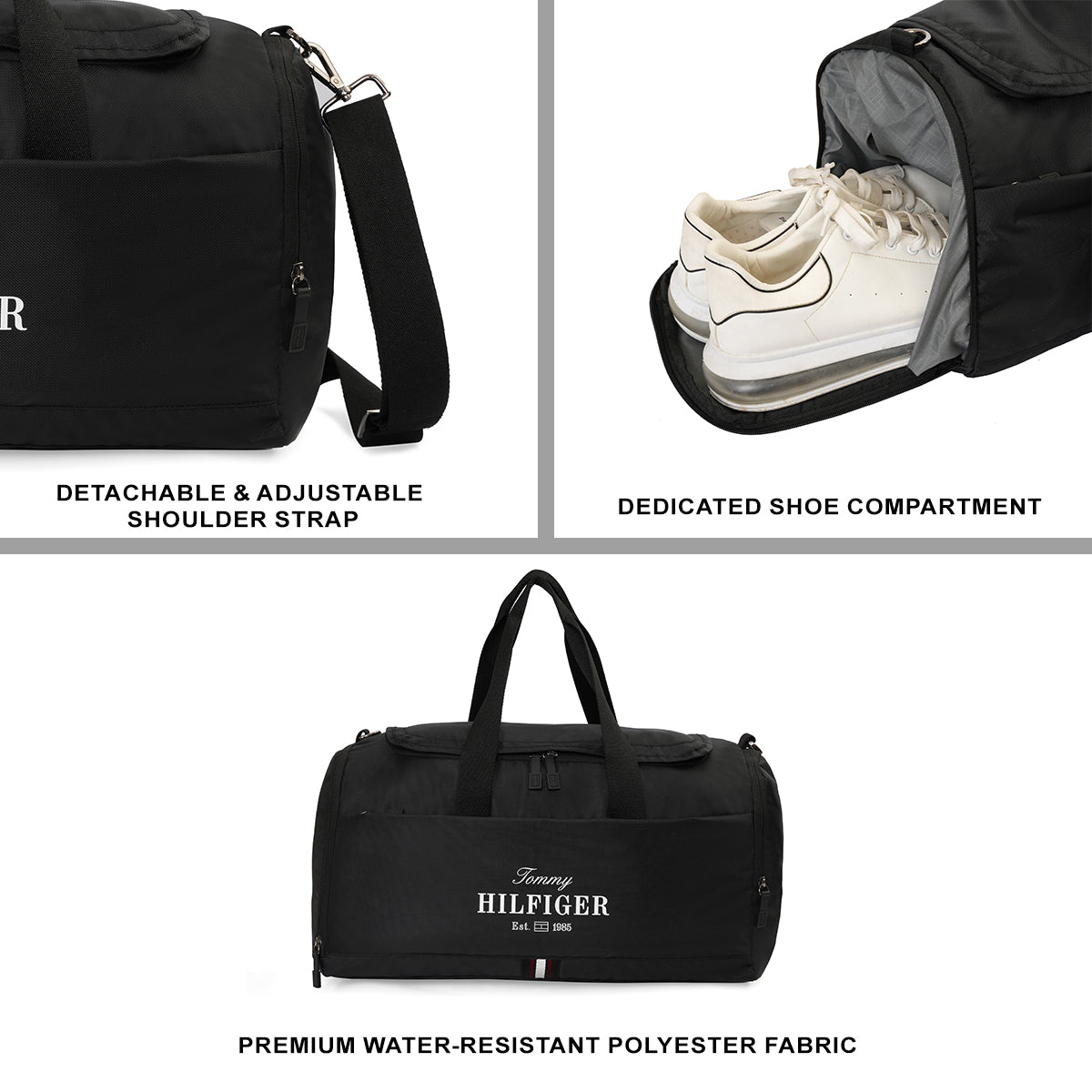 - Iconic Tommy Styling: Crafted from premium water-resistant polyester fabric, the bag showcases bold printed graphics on the front panel, branded pullers, and a sleek silhouette that blends sport with sophistication. The detachable and adjustable shoulder strap offers versatile carry options, making it perfect for gym sessions, weekend getaways, or daily commutes.