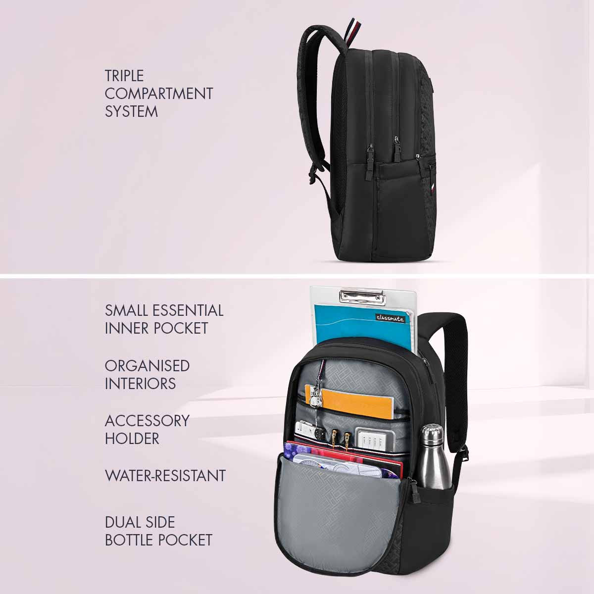 Ample space for books and supplies. Supports daily academic needs. Maintains structure. Easy organization. Ideal for school routines.