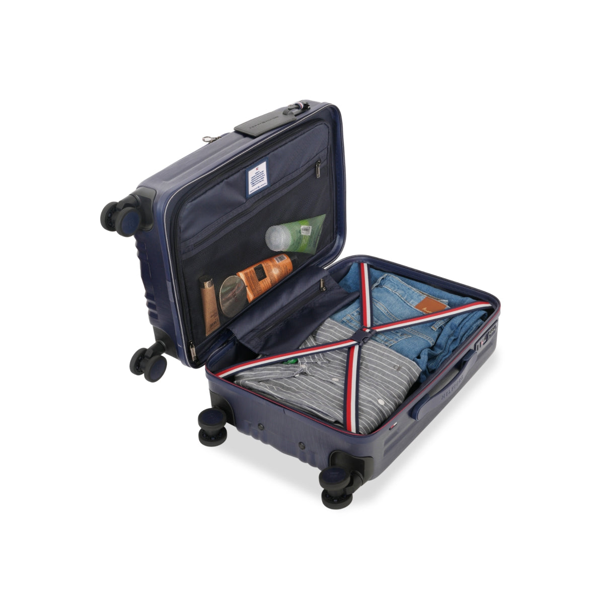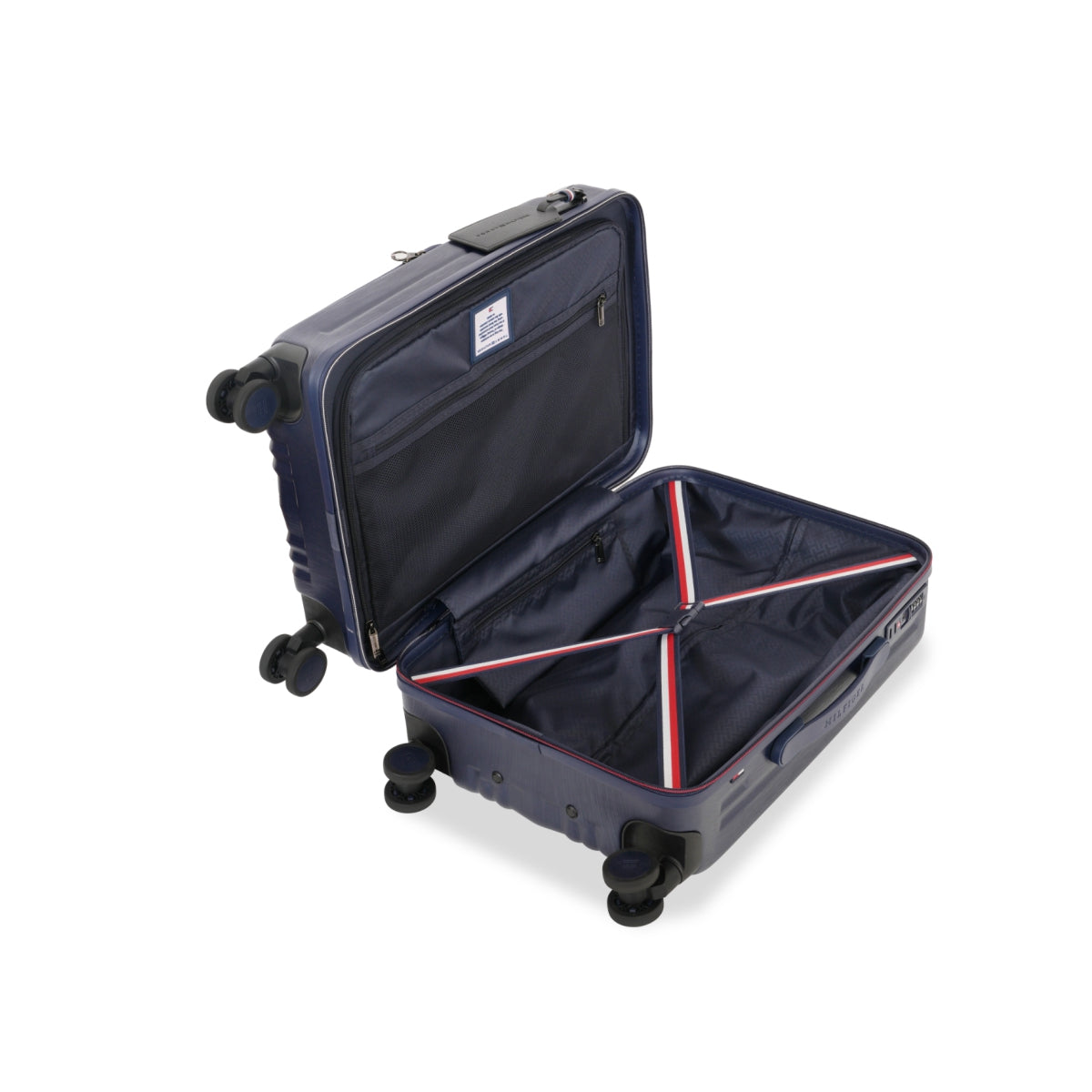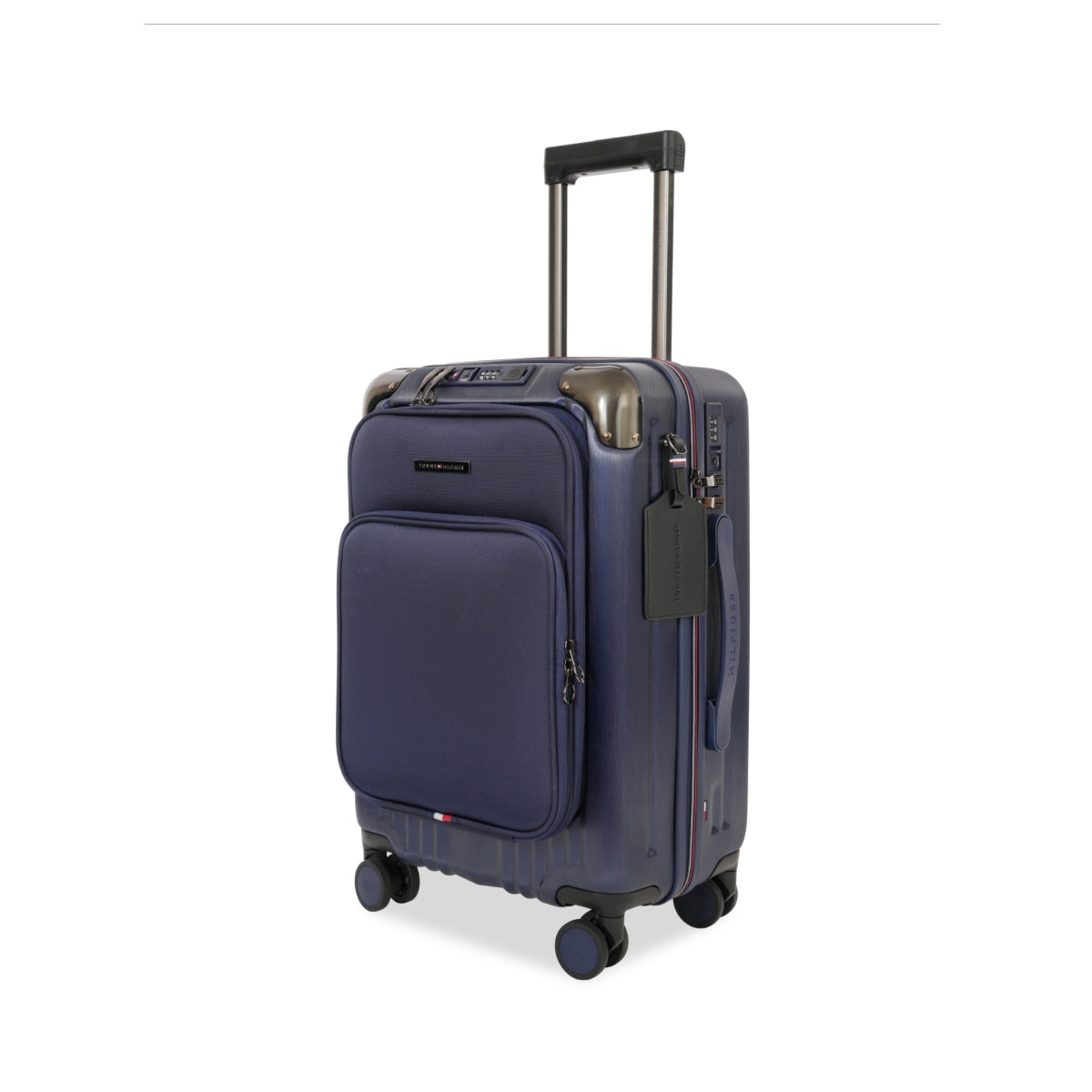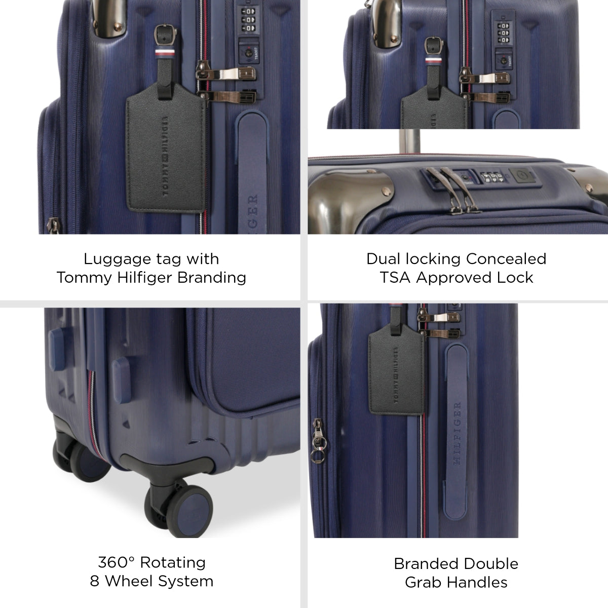 Premium & Durable Exterior: Crafted with a durable PC hard shell and a soft front pocket for quick access, this luggage combines a sleek, professional design with a classic signature look. It features a smooth-gliding 360° rotating 8-wheel system, sturdy branded double grab handles, and a telescopic trolley handle, all complemented by branded zipper pullers and a stylish Tommy Hilfiger luggage tag.