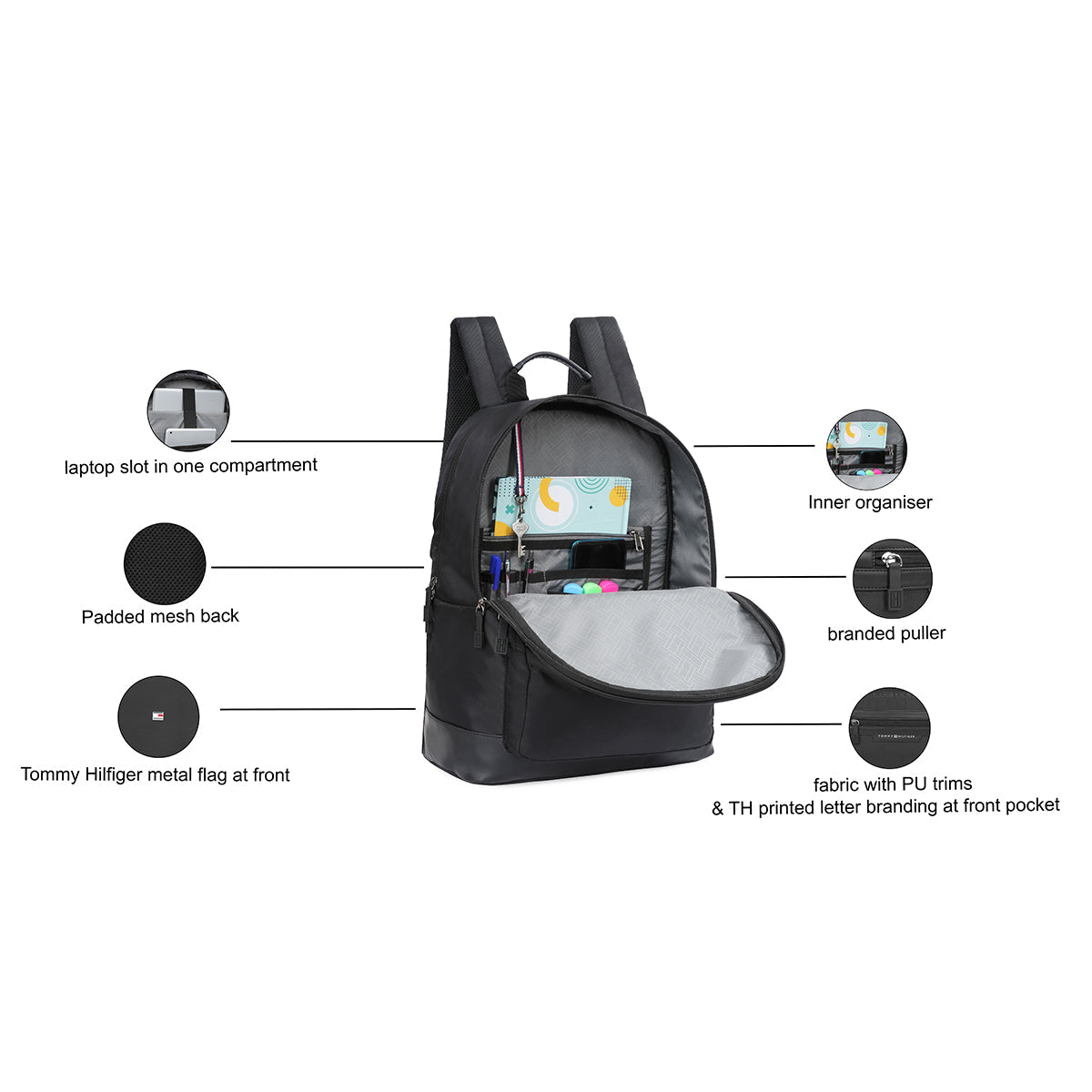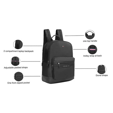 Introducing the Tommy Hilfiger Gibson Unisex Backpack, a perfect fusion of style and utility. Crafted from water-resistant polyester, this backpack features a zipper closure, a secure ladder lock strap and a plain pattern for a preppy edge. This bag features two compartments, three pockets, and two card slots for optimal organization, accommodating up to a 16-inch laptop. The printed branding on the front panel and the signature metal flag branding gives it a contemporary look. Elevate your daily ensemble with the Tommy Hilfiger Gibson Backpack.