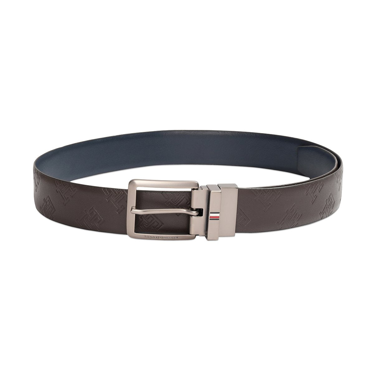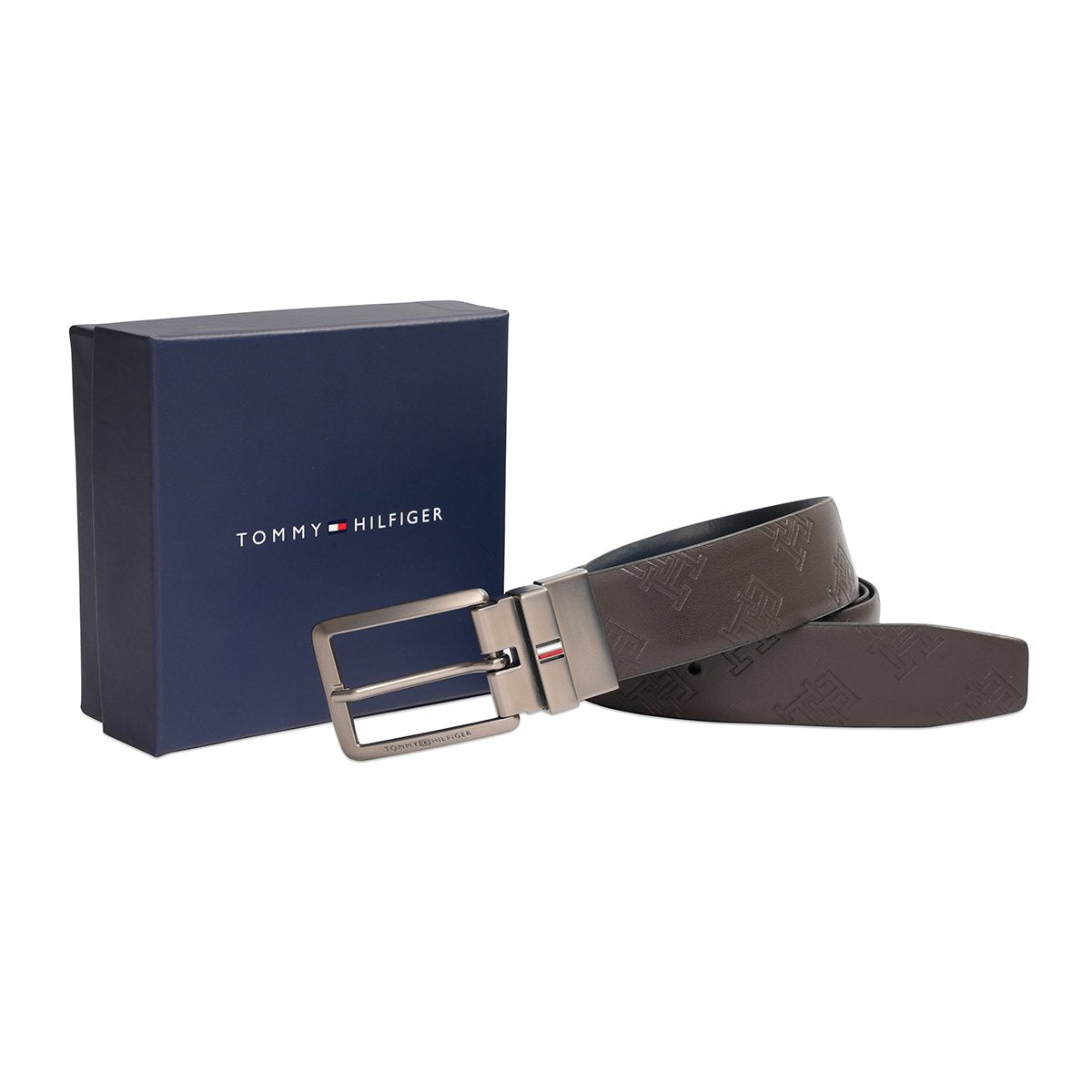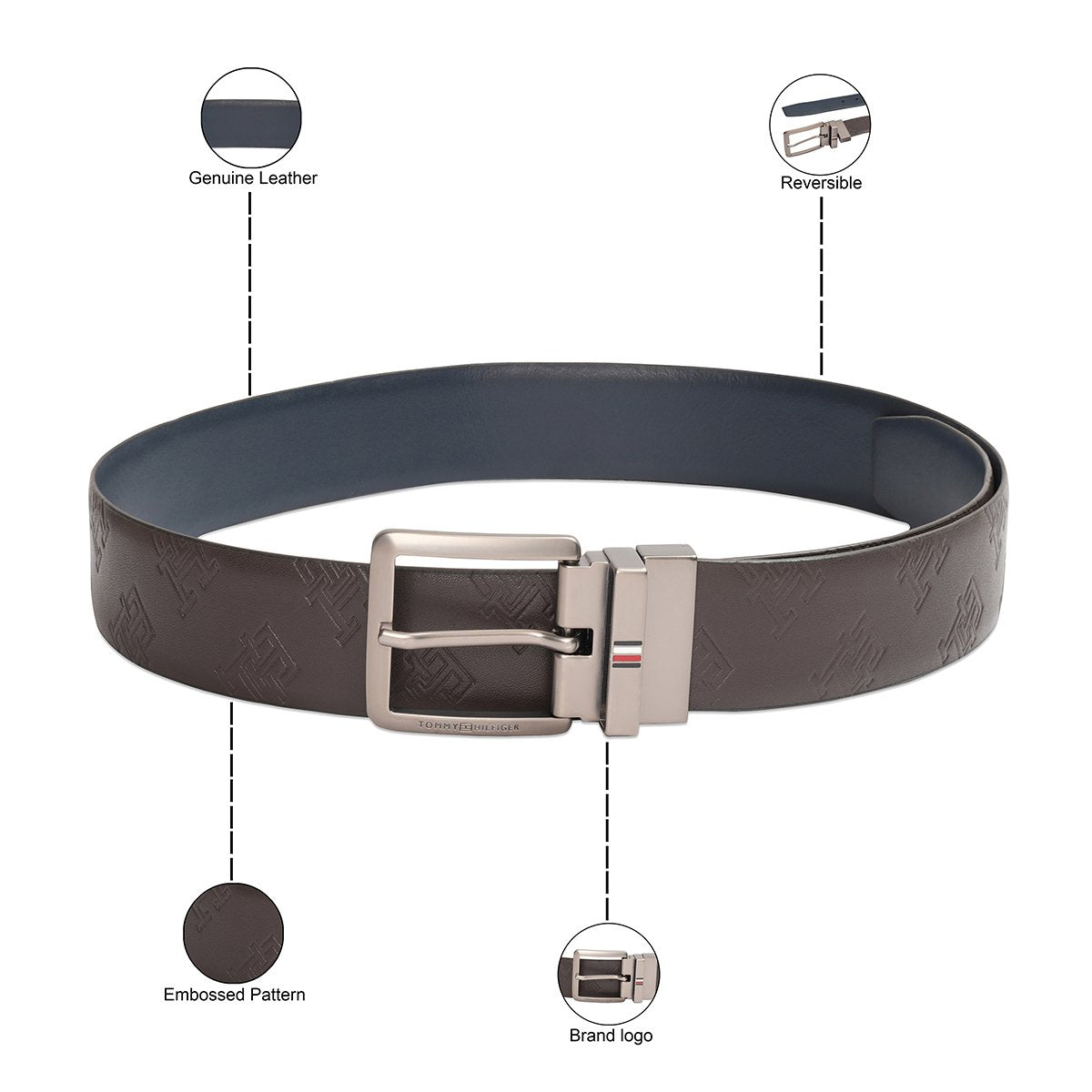 Refined Accents: Featuring an embossed texture, pin closure, and a matte gunmetal buckle with the Tommy Hilfiger striped logo, this belt adds a sophisticated and polished touch to your ensemble.