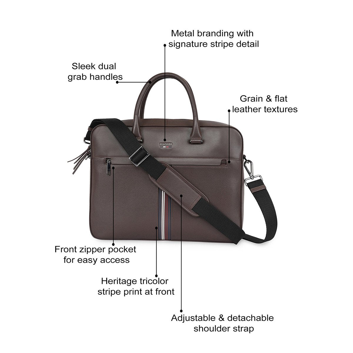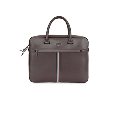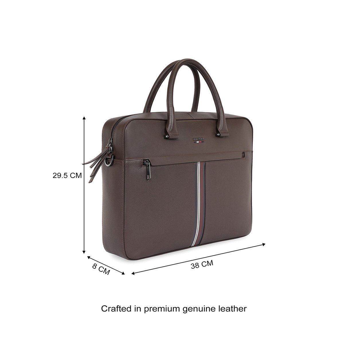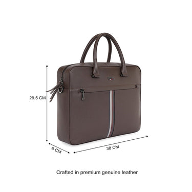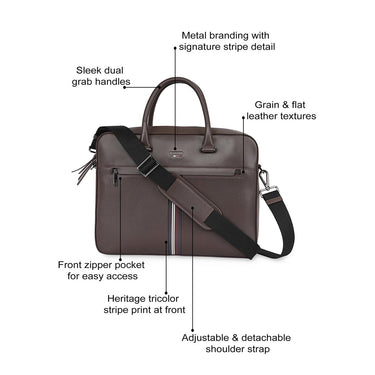 Elegant Design & Premium Build: Crafted in premium genuine leather with a mix of grain and flat textures, this bag showcases sleek dual grab handles, signature metal branding, and a heritage tricolor stripe print for a timeless, sophisticated look.