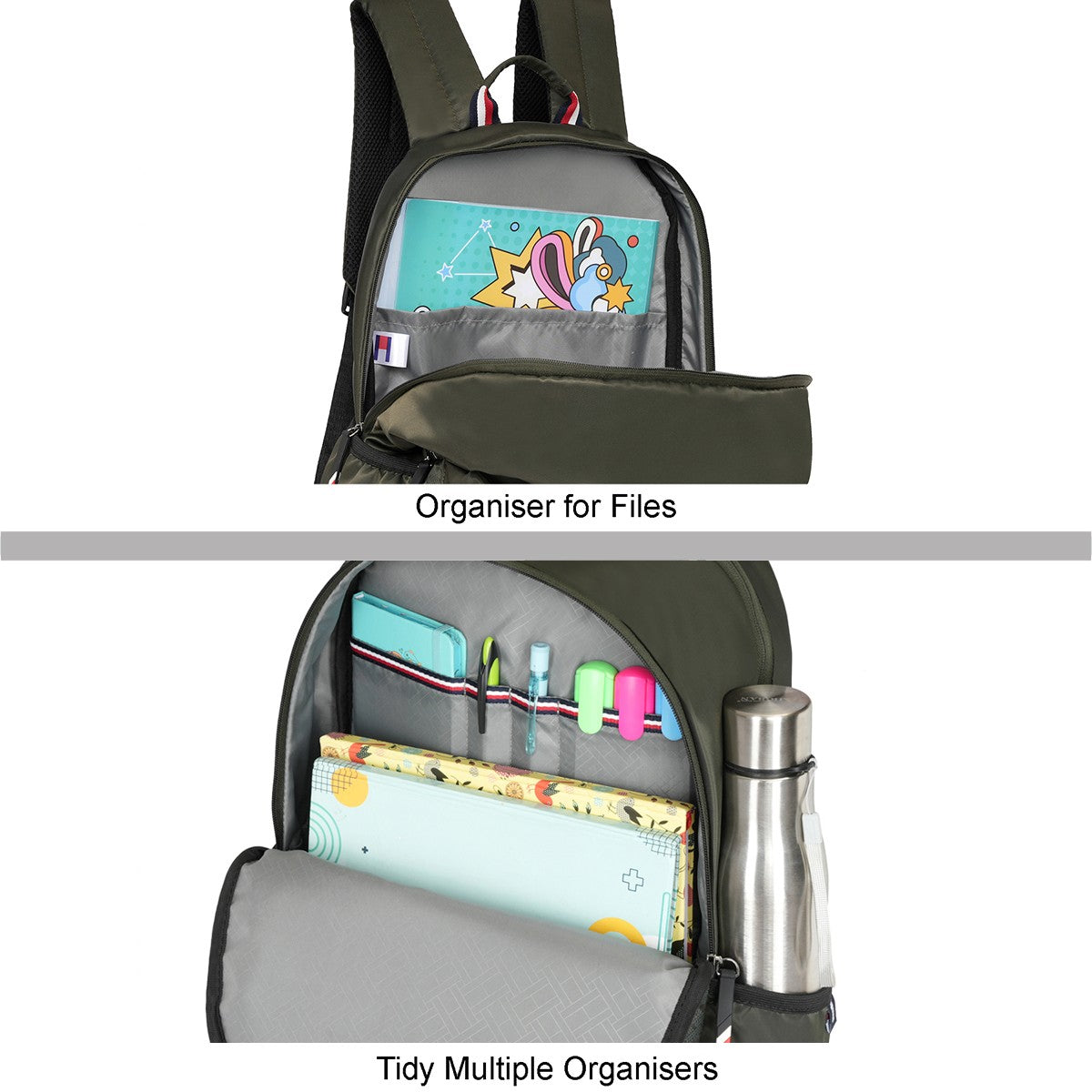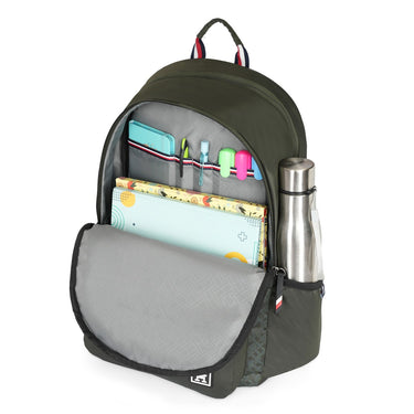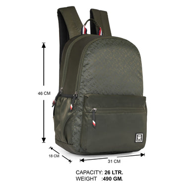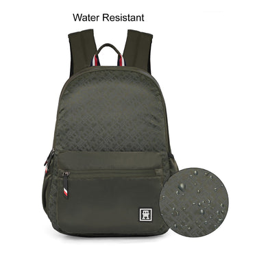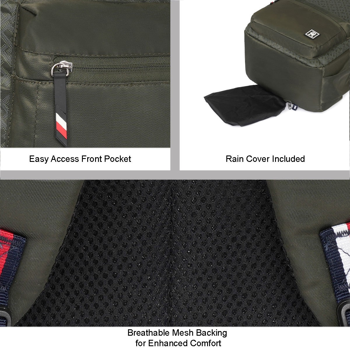 Introducing our classic olive backpack - designed to empower your daily journey to school and beyond. Its sleek design, featuring a subtle interlocking print and modern rubber emblem logo, exudes a sophisticated style. Whether you're heading to class, sports practice, or a weekend getaway, the comfortable, breathable mesh back and multiple compartments keep you organized and comfortable all day long. Plus, the water-resistant material and included rain cover ensure your belongings stay safe, no matter the weather.