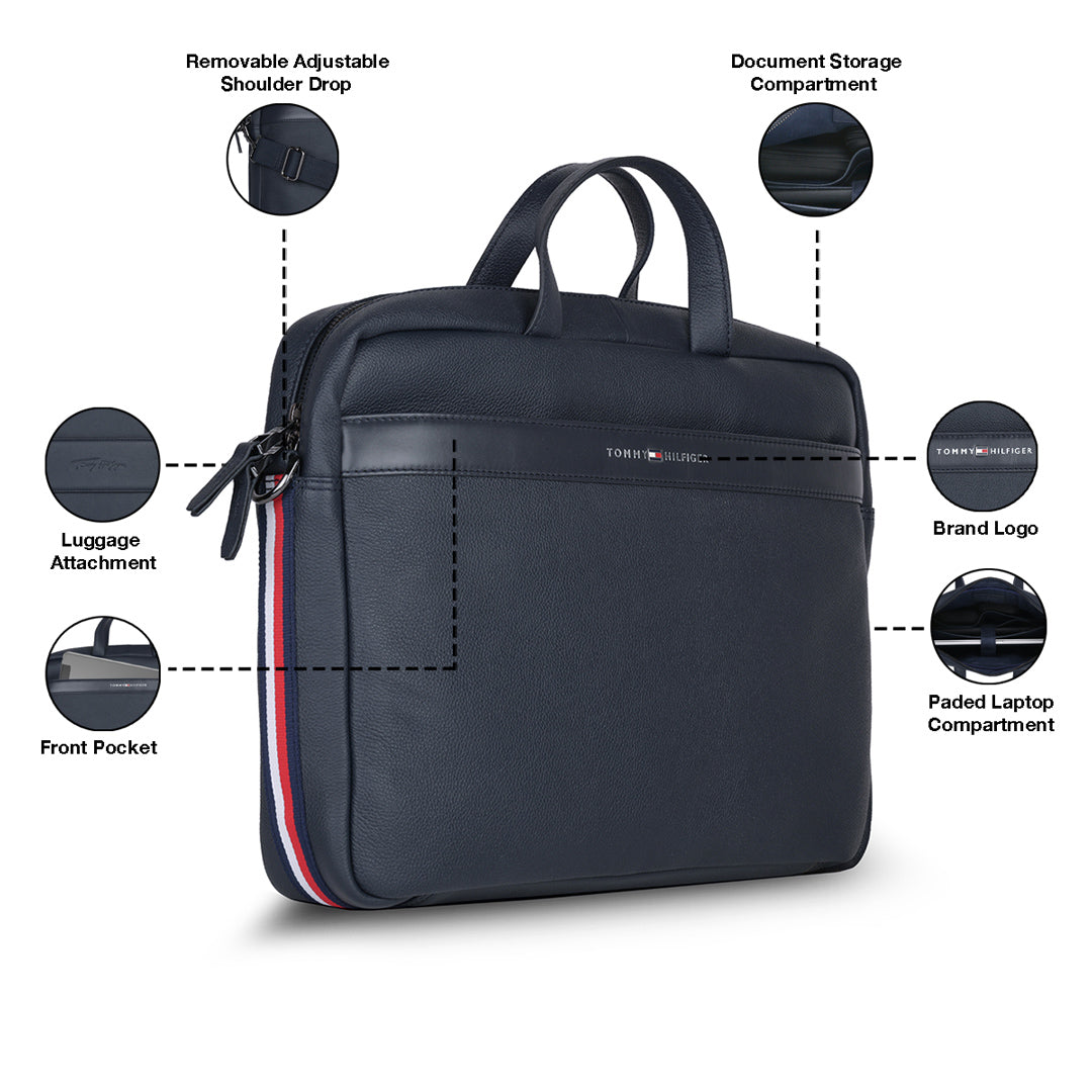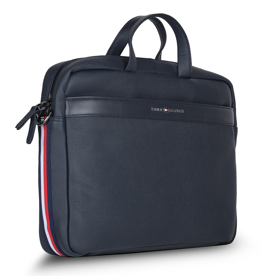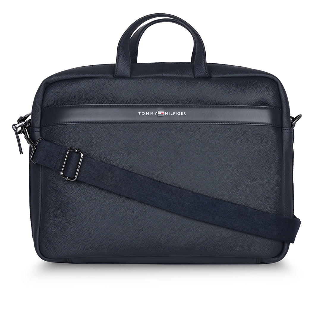 The Tommy Hilfiger Morbius Business Case is the pinnacle of sophistication and functionality. This stunning navy-colored business case is designed to suit your professional lifestyle by seamlessly blending elegance and functionality. It is made of fine leather and emanates durability and style. The case is ideal for travel and daily usage, with a textured printed pattern that sets it different from the crowd. Carry it easily with the adjustable and detachable webbing strap, which provides versatility and comfort. The inner cotton lining protects and organises your things in a stylish manner. The Morbius Business Case embraces a casual yet traditional charm, making it a must-have accessory for the targeting modern professional, whether you're heading to the office or attending meetings.
