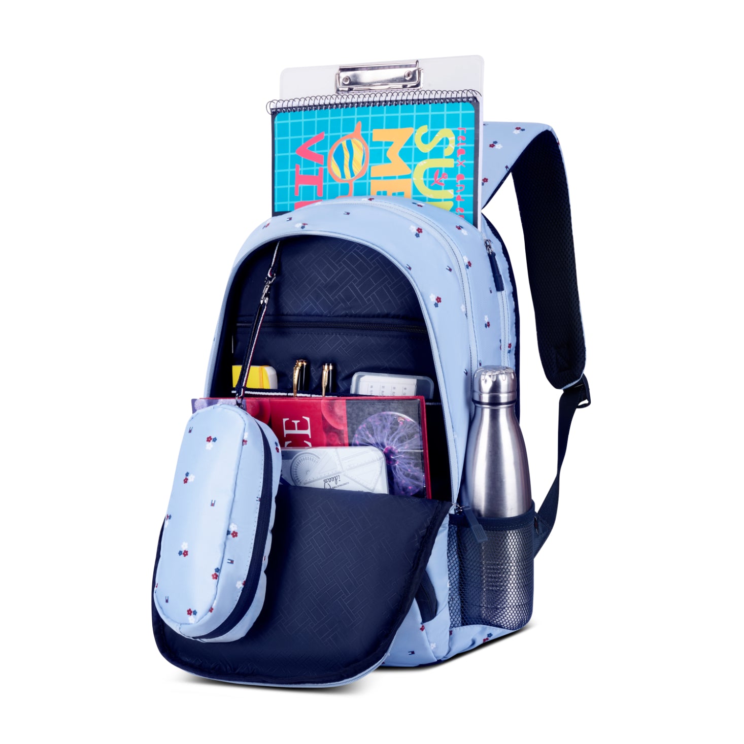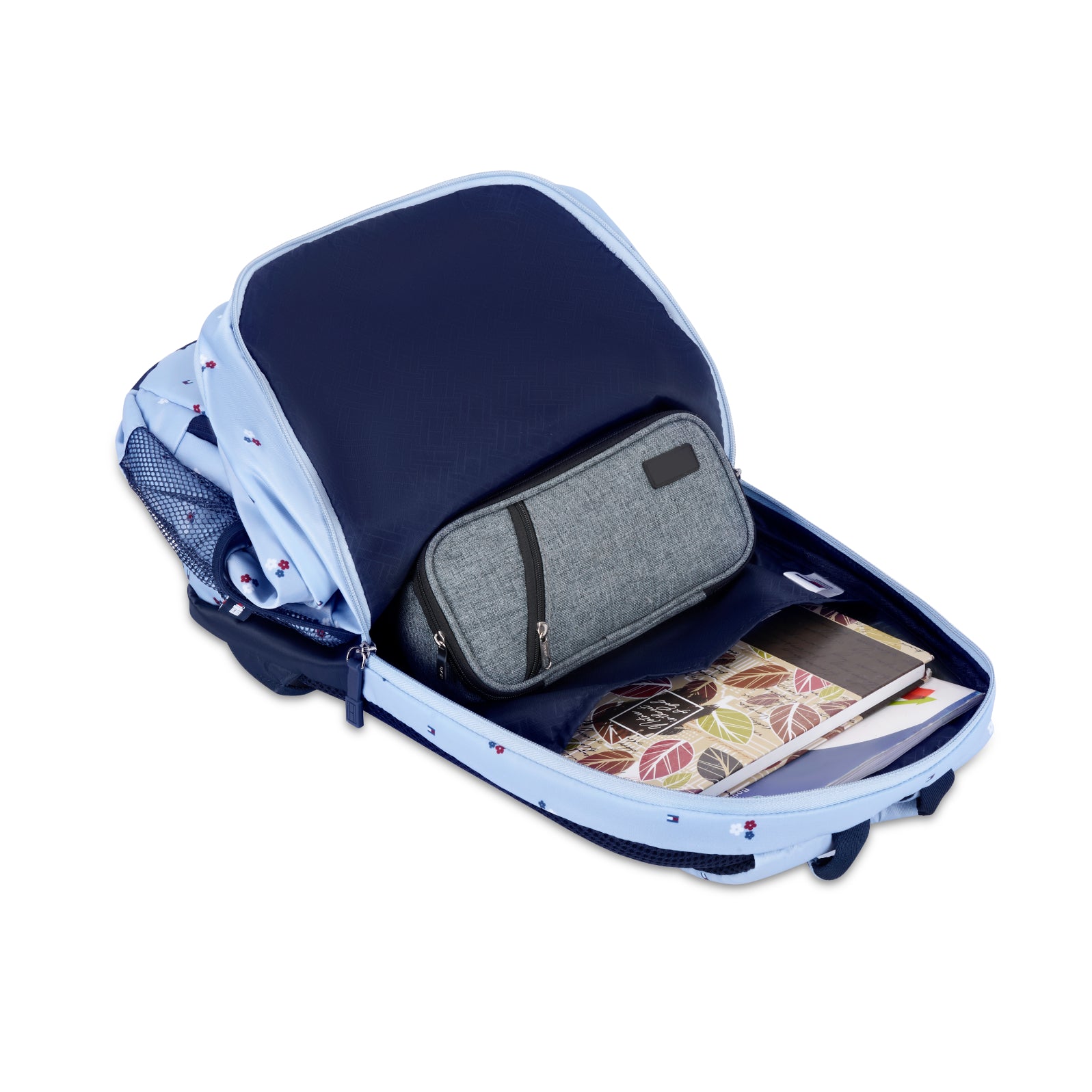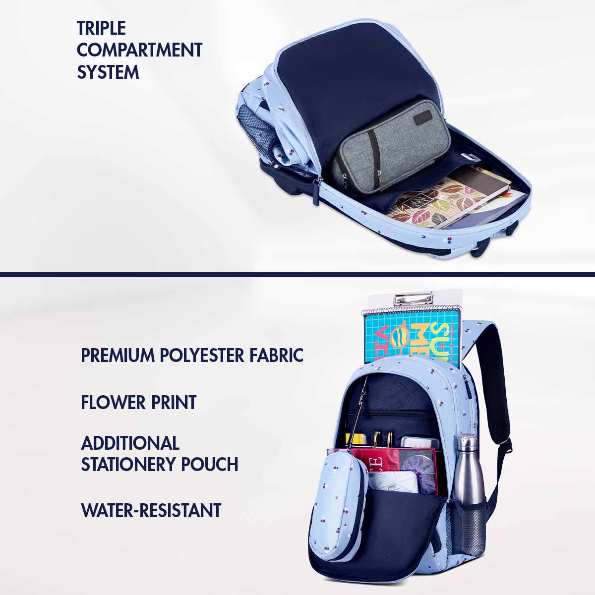 Spacious interior supports heavy books. Organized layout. Maintains balance. Ideal for higher grades. Academic support.