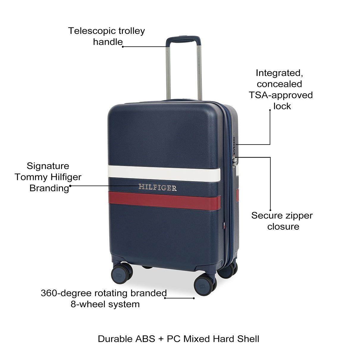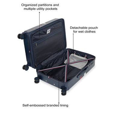 Robust and Stylish Exterior: This luggage is crafted with a durable ABS + PC mixed hard shell and features signature Tommy Hilfiger branding, making a bold statement. Side guards provide added durability and protection, while the secure zipper closure offers an expandable capacity for extra packing space.